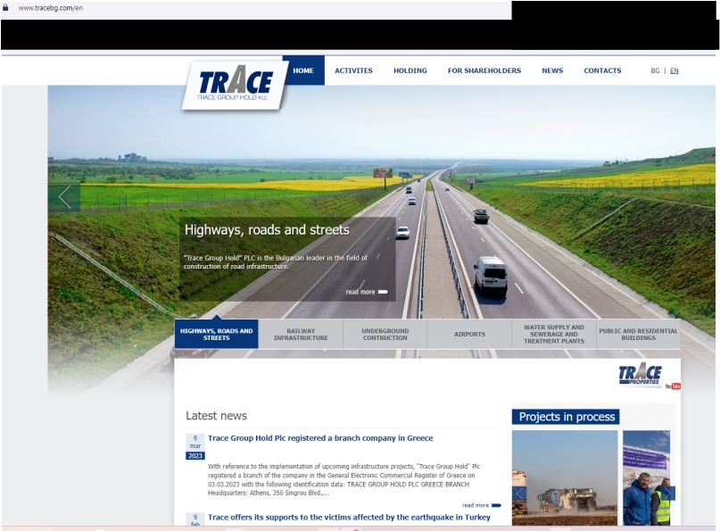 หน้าเว็บไซต์บริษัท Trace Group Hold ระบุว่าเป็นบริษัทก่อสร้างใหญ่สุดในบัลแกเรีย