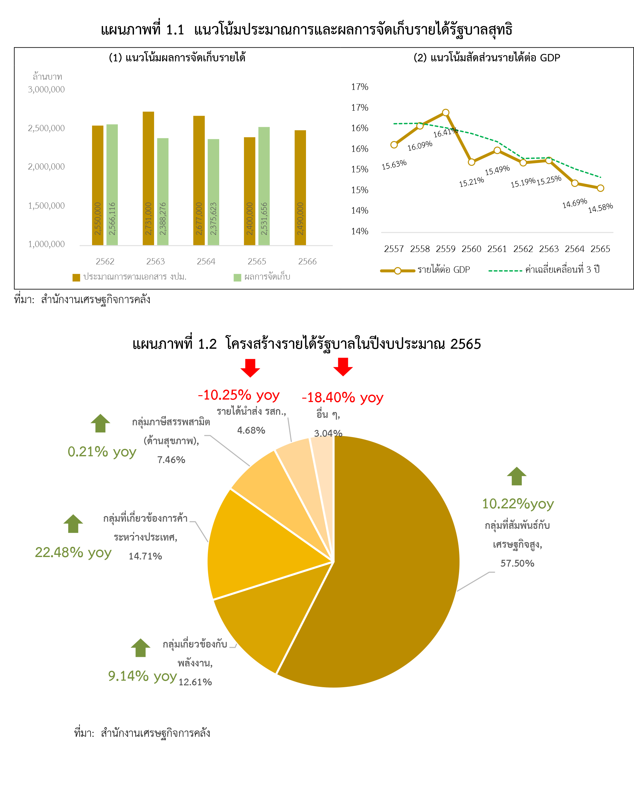 นอกจากนี้ ยังได้รับอานิสงค์จากราคาน้ำมันดิบที่เพิ่มสูงขึ้น และอัตราแลกเปลี่ยนที่อ่อนค่าลง อย่างไรก็ดี เม็ดเงินของผลการจัดเก็บในปีงบประมาณ 2565 ยังคงต่ำกว่าช่วงก่อนเกิดวิกฤต (ปีงบ 2562) ในขณะที่สัดส่วนรายได้รัฐบาลสุทธิต่อ GDP (ปีปฏิทิน) ในปีงบฯ 2565 ยังลดลงต่อเนื่องอยู่ที่ 14.58%