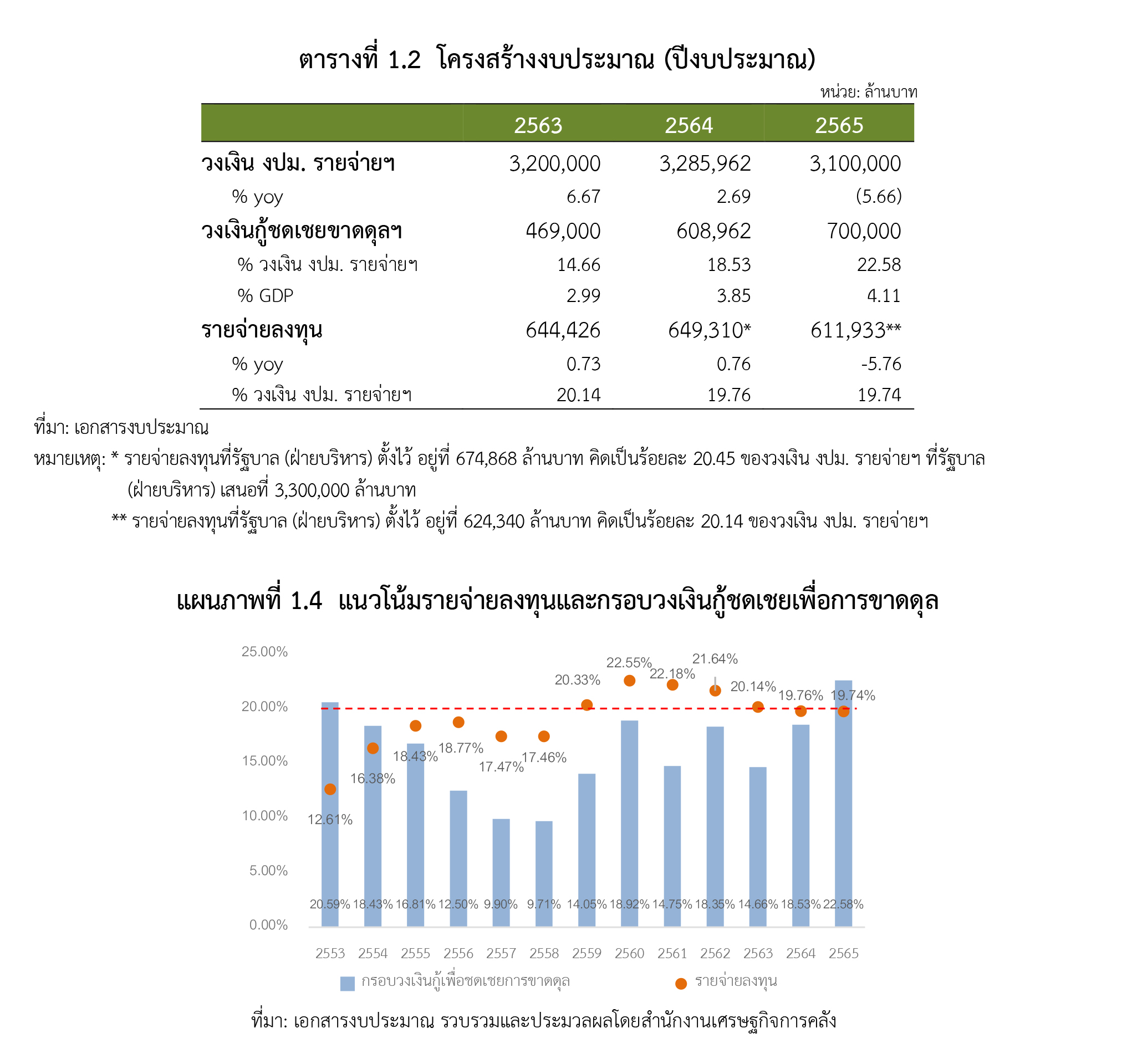 อย่างไรก็ดี สัดส่วนรายจ่ายลงทุนต่องบประมาณรายจ่ายฯปี 2565 ยังคงสูงกว่าช่วงปีงบฯ 2553-2558 สะท้อนให้เห็นถึงเจตนารมณ์และผลสัมฤทธิ์ของการบังคับใช้ พ.ร.บ.วินัยการเงินการคลังฯ ที่ต้องการให้รัฐบาลให้ความสำคัญกับการจัดสรรงบประมาณรายจ่ายลงทุนซึ่งเป็นรายจ่ายที่ส่งผลระยะยาวต่อการพัฒนาเศรษฐกิจของประเทศ และพยายามลดทอนรายจ่ายประจำเป็นลำดับแรก โดยเฉพาะกรณีที่วงเงินงบประมาณรายจ่ายขยายตัวได้ในระดับต่ำหรือมีการหดตัว