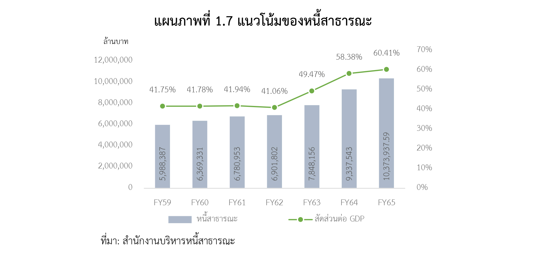 ระดับหนี้สาธารณะ ณ สิ้นปีงบฯ 2565 มีจำนวน 10,373,937.59 ล้านบาท คิดเป็น 60.41% ต่อ GDP ยังอยู่ภายใต้กรอบที่คณะกรรมการ นโยบายการเงินการคลังของรัฐกำหนดให้ไม่เกิน 70%