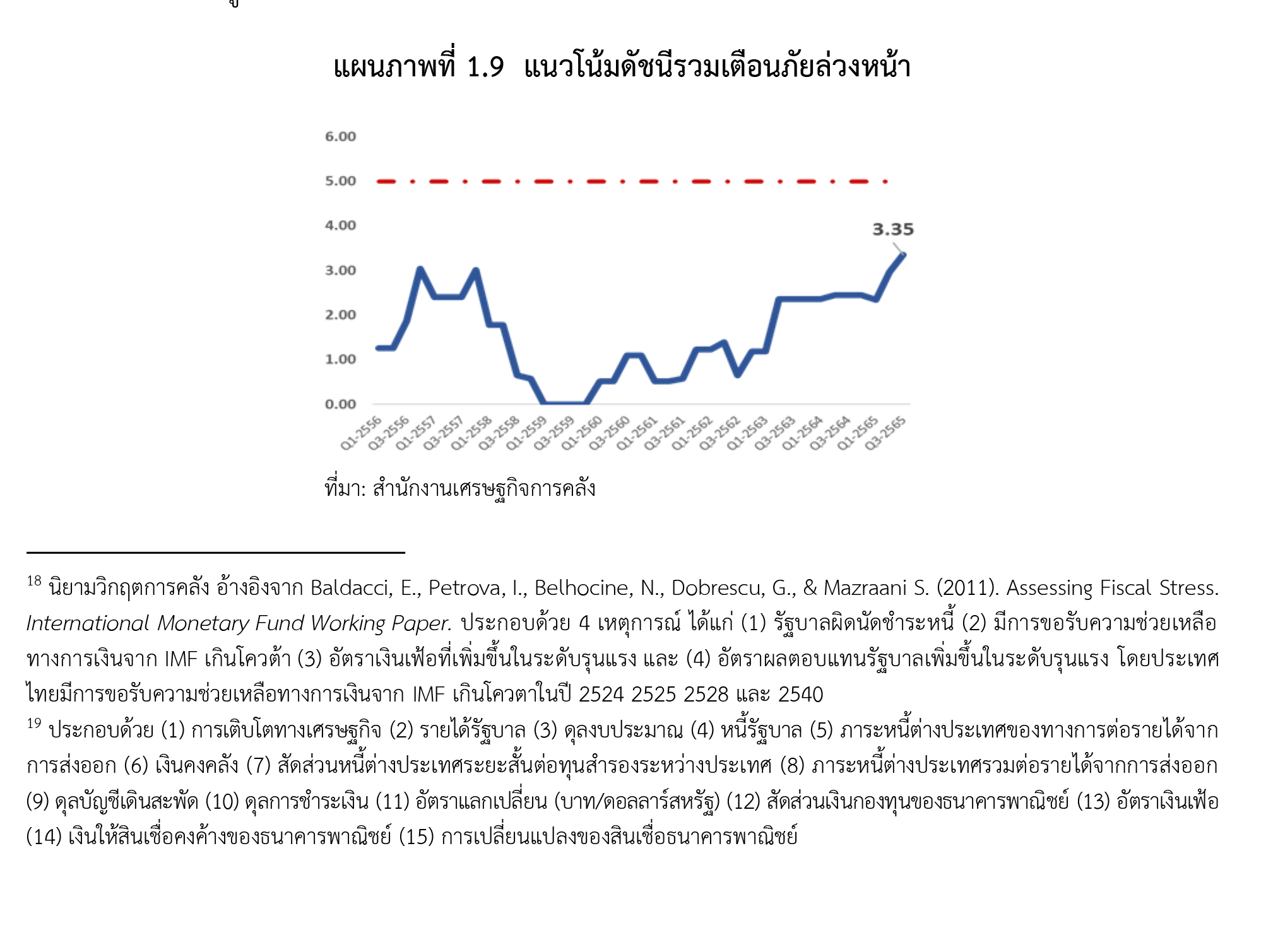 “…ค่าดัชนีรวมฯ ณ สิ้นปีงบฯ 2565 มีค่าอยู่ที่ 3.35 ปรับตัวสูงขึ้นจาก 2.45 ณ สิ้นปีงบฯ 2564 ยังอยู่ในระดับปกติ แต่เข้าใกล้ระดับขีดเตือนภัยที่ค่า 5 มากขึ้น รัฐบาลจึงควรให้ความสำคัญในการลดระดับการก่อหนี้ในระดับสูงโดยเร็ว เพื่อลดแรงกดดันของความเสี่ยงที่มีต่อภาคการคลังในอนาคตลง…”
