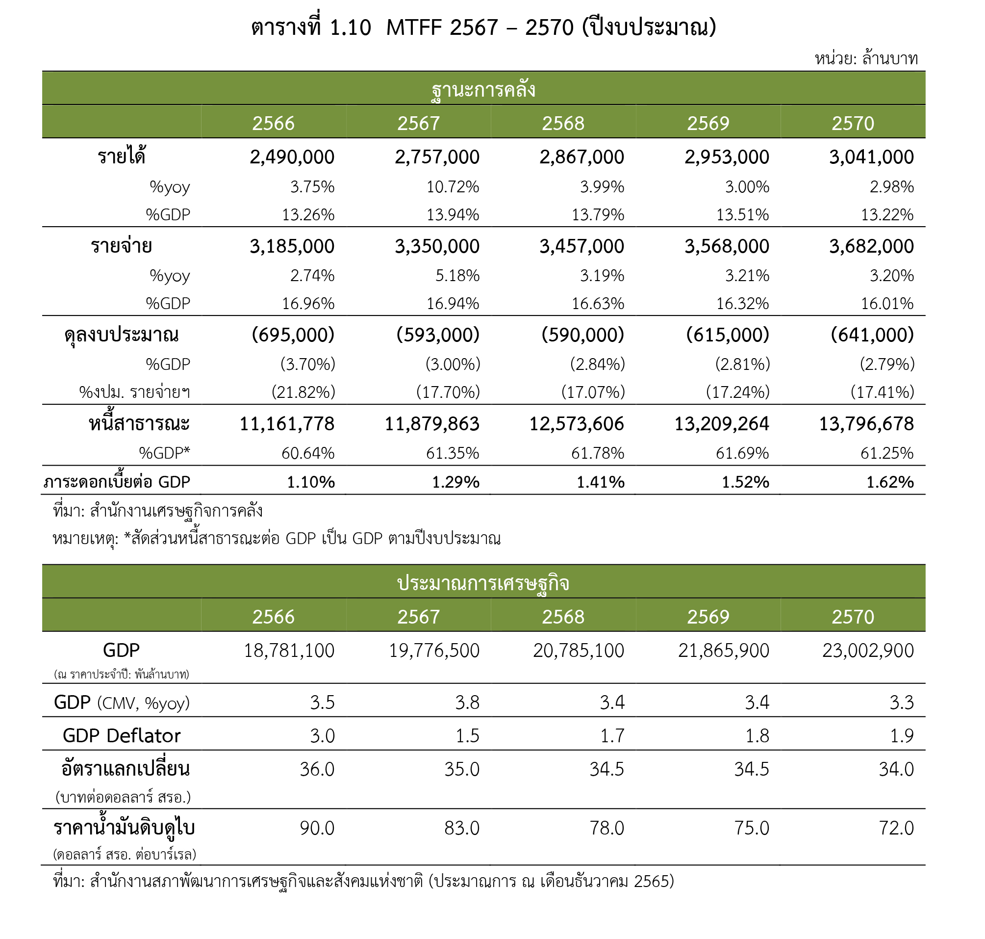 ทั้งนี้ ระดับหนี้สาธารณะในอนาคตระยะปานกลางมีแนวโน้มดีขึ้นเมื่อเทียบกับ MTFF ฉบับก่อน (ปีงบฯ 2566–2569) จากการกำหนดระดับการขาดดุลไม่เกิน 3% ต่อ GDP โดยประมาณการสัดส่วนหนี้สาธารณะต่อ GDP ณ สิ้นปีงบฯ 2570 อยู่ที่ 61.25% ต่อ GDP เพิ่มขึ้นเพียงเล็กน้อยจาก 60.64% ณ สิ้นปีงบฯ 2566