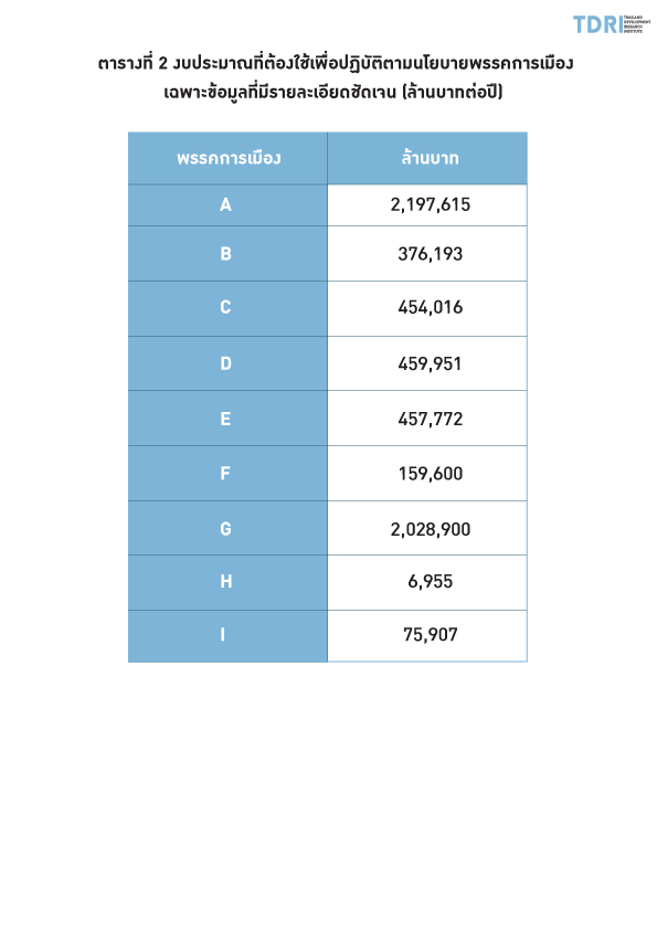 ทีมวิจัยของสถาบันวิจัยเพื่อการพัฒนาประเทศไทย(TDRI)ประมาณการพบว่า มีอย่างน้อย 2 พรรคการเมืองที่น่าจะต้องใช้เงินงบประมาณเพิ่มขึ้นจากปัจจุบันอีกกว่า 2 ล้านล้านบาทต่อปี เพื่อดำเนินนโยบายที่ประกาศไว้ และหากรวมต้นทุนด้านการคลังของนโยบายของทั้ง 9 พรรคการเมือง (โดยไม่นับนโยบายที่ซ้ำกัน) ก็จะต้องใช้งบประมาณเพิ่มขึ้นทั้งหมด 3.14 ล้านล้านบาทต่อปี หรือเพิ่มขึ้นเกือบเท่าตัวจากงบประมาณรายจ่ายสำหรับปี 2566