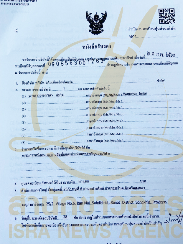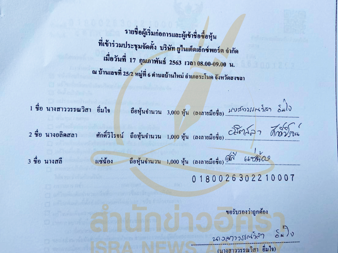 จากการตรวจสอบข้อมูลกับกรมพัฒนาธุรกิจการค้าพบว่า บริษัท ยูไนเต็ดเอ็กซ์พอร์ต จำกัด จดทะเบียนวันที่ 21 ก.พ.2563 ทุน 500,000 บาท ประกอบกิจการขายส่ง ขายปลีก ผลิตภัณฑ์เนื้อสัตว์สำเร็จรูป แช่แข็งผลิตภัณฑ์สัตว์น้ำ อาหารทะเลแช่แข็ง ที่ตั้งเลขที่ 25/2 หมู่ 6 ตำบลบ้านใหม่ อำเภอระโนด จังหวัดสงขลา นางสาว วรรณวิสา อิ่มใจ เป็นกรรมการ