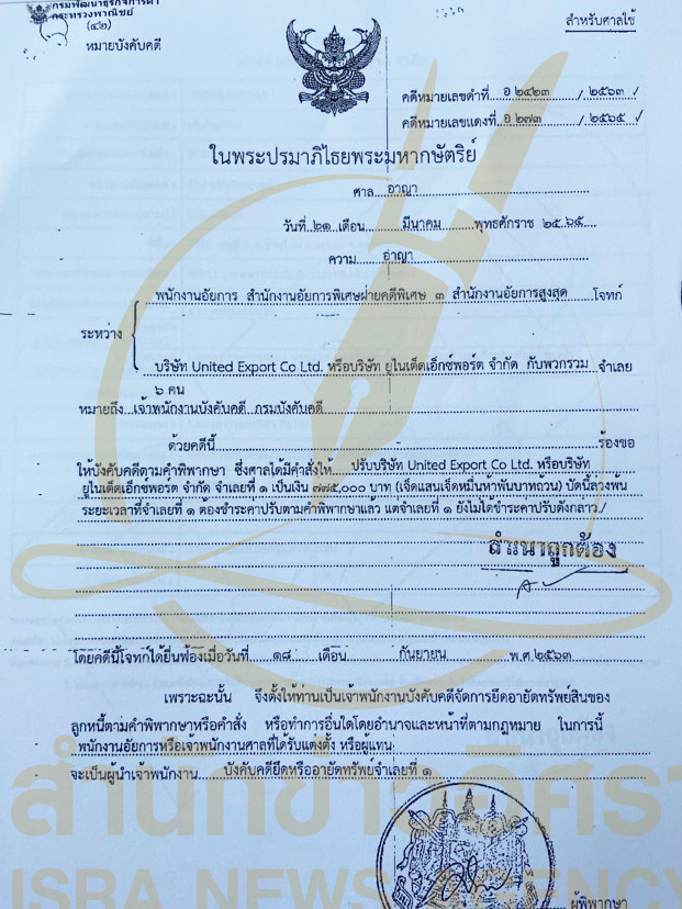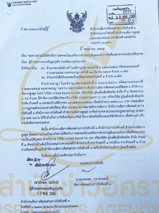 จากการตรวจสอบพบว่า เมื่อวันที่ 5 พ.ค.2565 อัยการพิเศษฝ่ายบังคับคดี 3 สำนักงานการบังคับคดี สำนักงานอัยการสูงสุด มีหนังสือถึงผู้อำนวยการกองข้อมูลธุรกิจ กรมพัฒนาธุรกิจการค้า ขอความร่วมมือให้ระงับการจดทะเบียนเสร็จการชำระบัญชีและระงับการขีดชื่อออกจากทะเบียนนิติบุคคล รายบริษัท ยูไนเต็ดเอ็กซ์พอร์ต จำกัด ให้เหตุผลว่า ศาลอาญามีคำพิพากษาคดีหมายเลขดำที่ อ 2423 /2563 คดีหมายเลขแดงที่ อ 273/2563 ระหว่าง พนักงานอัยการ สำนักงานอัยการพิเศษฝ่ายคดีพิเศษ 3 สำนักงานอัยการสูงสุด โจทก์ บริษัท United Export Co Ltd. หรือ บริษัท ยูไนเต็ดเอ็กซ์พอร์ต จำกัด ที่ 1 กับพวกรวม 6 คนมีคำพิพากษาลงโทษปรับ บริษัท United Export Co Ltd. หรือ บริษัท ยูไนเต็ดเอ็กซ์พอร์ต จำกัด จำเลยที่ 1 เป็นเงิน 775,000 บาท
