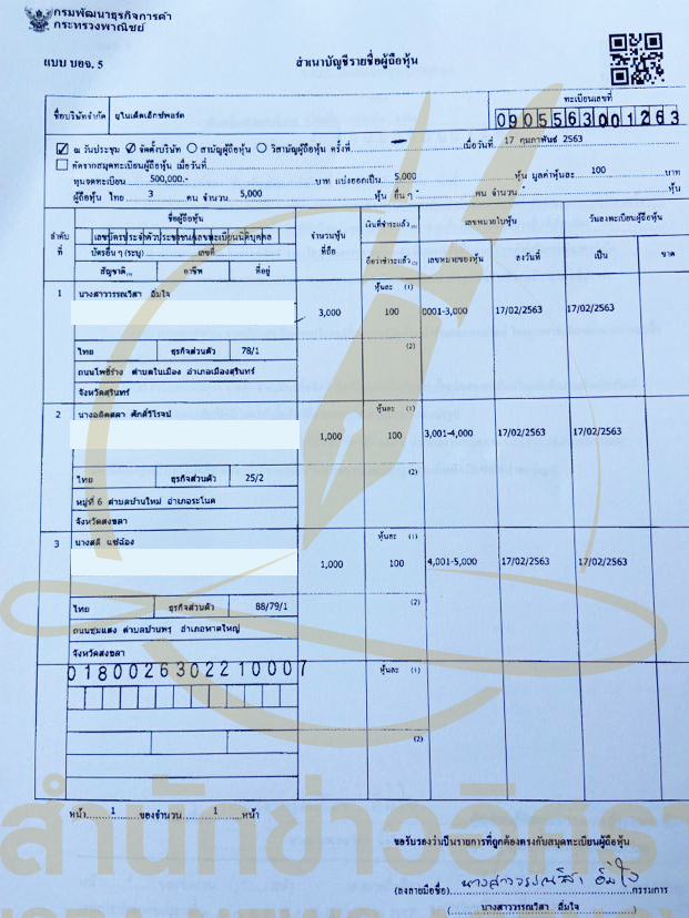 บัญชีรายชื่อผู้ถือหุ้นล่าสุด ณ วันประชุมผู้ถือหุ้น 17 ก.พ. 2563 นางสาววรรณวิสา อิ่มใจ อายุ 35 ปี แจ้งที่อยู่ ต.ในเมือง อ.เมือง จ.สุรินทร์ 3,000 หุ้น นางอลิตสลา ศักดิ์วิโรจน์ และ นางสลี แซ่ฉ้อง คนละ 1,000 หุ้น รวมทั้งหมด 5,000 หุ้น มูลค่าหุ้นละ 100 บาท (ดูเอกสาร)