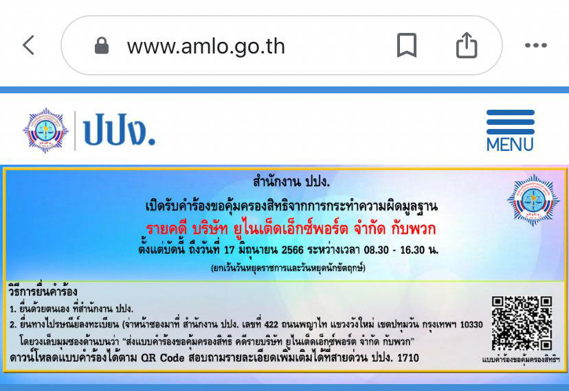สืบเนื่องจากวันที่ 20 มี.ค.2566 ราชกิจจานุเบกษา เผยแพร่ประกาศสำนักงานป้องกันและปราบปรามการฟอกเงิน เรื่อง ให้ผู้เสียหายยื่นคำร้องขอคุ้มครองสิทธิจากการกระทำความผิดมูลฐาน รายคดี บริษัท ยูไนเต็ดเอ็กซ์พอร์ต จำกัด กับพวก ความผิดเกี่ยวกับการฉ้อโกงประชาชน หลังคณะกรรมการธุรกรรมได้มีมติในการประชุมครั้งที่ 3/2566 เมื่อวันที่ 14 มี.ค. 2566 ให้ยึดและอายัดทรัพย์สินที่เกี่ยวกับการกระทำความผิดไว้ชั่วคราว มีกำหนดไม่เกิน 90 วัน