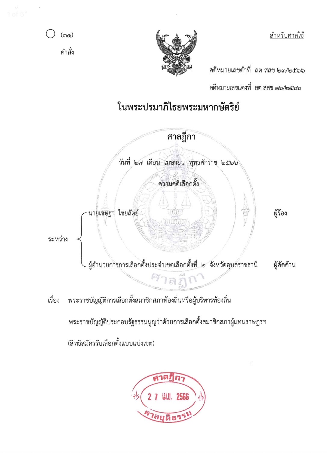 เมื่อวันที่ 27 เม.ย. 2566 ศาลฎีกา มีคำสั่งยกคำร้องของ นายเชษฐา ไชยสัตย์ ผู้สมัครรับเลือกตั้งเป็น ส.ส. แบบแบ่งเขตพรรครวมไทยรักษาชาติ กรณียื่นคำร้องต่อศาลว่า ผู้อำนวยการเลือกตั้งประจำเขตเลือกตั้งที่ 2 จังหวัดอุบลราชธานี ไม่ประกาศรายชื่อผู้ร้อง เป็นผู้สมัครรับเลือกตั้ง ส.ส. โดยให้เหตุผลว่า ผู้ร้องไม่ไปใช้สิทธิเลือกตั้งและมิได้แจ้งเหตุที่ไม่อาจไปใช้สิทธิเลือกตั้งซ่อมสภาเทศบาลเมืองวารินชำราบ จึงเป็นผู้ถูกจำกัดสิทธิในการรับสมัครรับเลือกตั้งเป็น ส.ส. ตามพระราชบัญญัติการเลือกตั้งสมาชิกสภาท้องถิ่นหรือผู้บริหารท้องถิ่น พ.ศ.2562 มาตรา 42 (1)