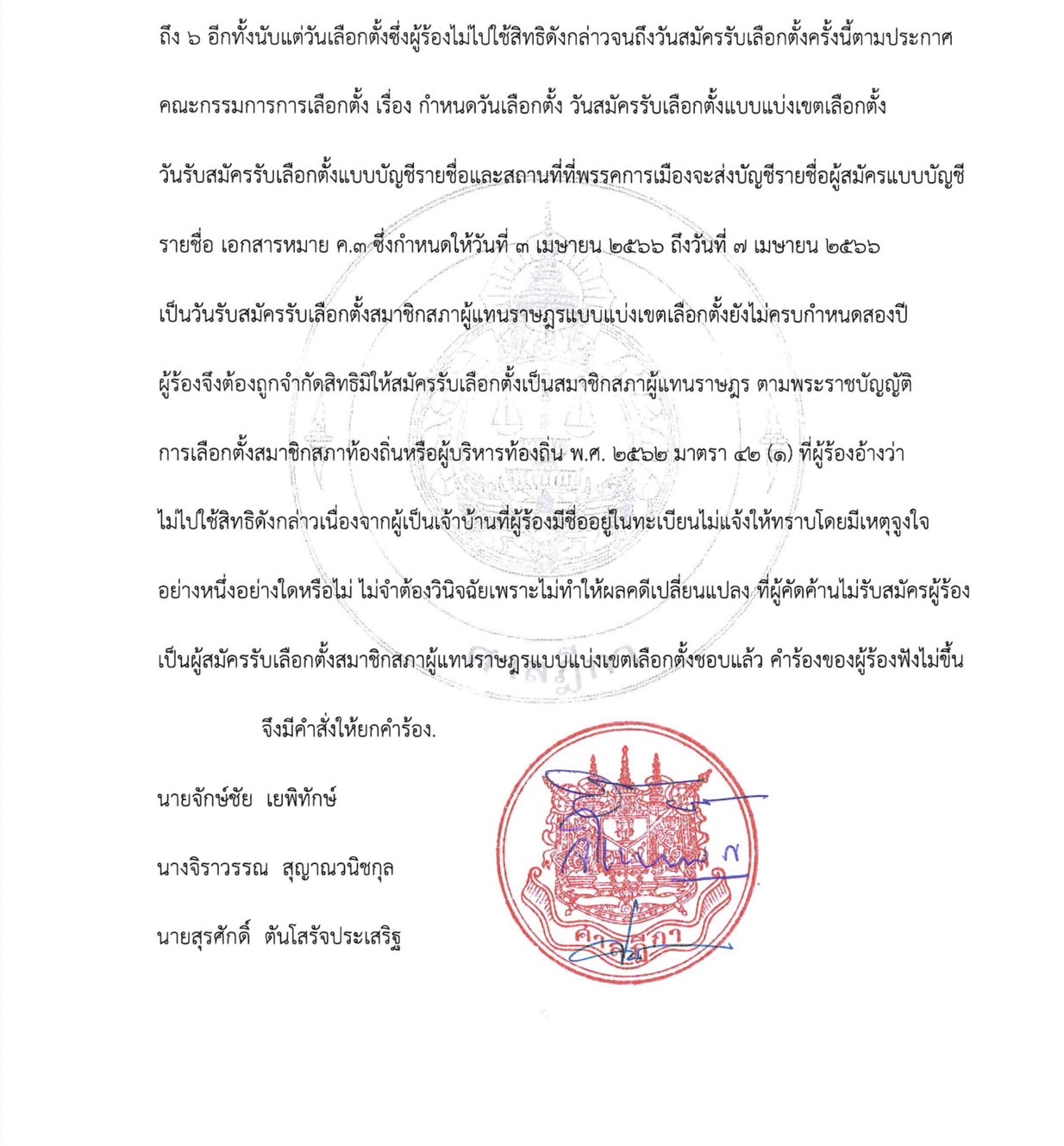 ผู้ร้องจึงต้องถูกจำกัดสิทธิมิให้สมัครรับเลือกตั้งเป็นสมาชิกสภาผู้แทนราษฎร ตามพระราชบัญญัติการเลือกตั้งสมาชิกสภาท้องถิ่นหรือผู้บริหารท้องถิ่น พ.ศ. 2562 มาตรา 42 (1) ที่ผู้ร้องอ้างว่าไม่ไปใช้สิทธิดังกล่าวเนื่องจากผู้เป็นเจ้าบ้านที่ผู้ร้องมีชื่ออยู่ในทะเบียนไม่แจ้งให้ทราบโดยมีเหตุจูงใจอย่างหนึ่งอย่างใดหรือไม่ ไม่จำต้องวินิจฉัยเพราะไม่ทำให้ผลคดีเปลี่ยนแปลง ที่ผู้คัดค้านไม่รับสมัครผู้ร้องเป็นผู้สมัครรับเลือกตั้งสมาชิกสภาผู้แทนราษฎรแบบแบ่งเขตเลือกตั้งชอบแล้ว คำร้องของผู้ร้องฟังไม่ขึ้น