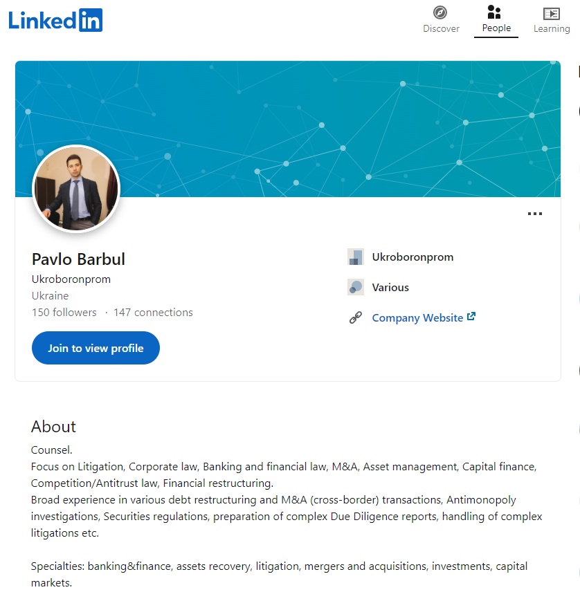 เพจ LinkedIn นายพาฟโล บาร์บูล อดีตเจ้าหน้าที่ยูเครน