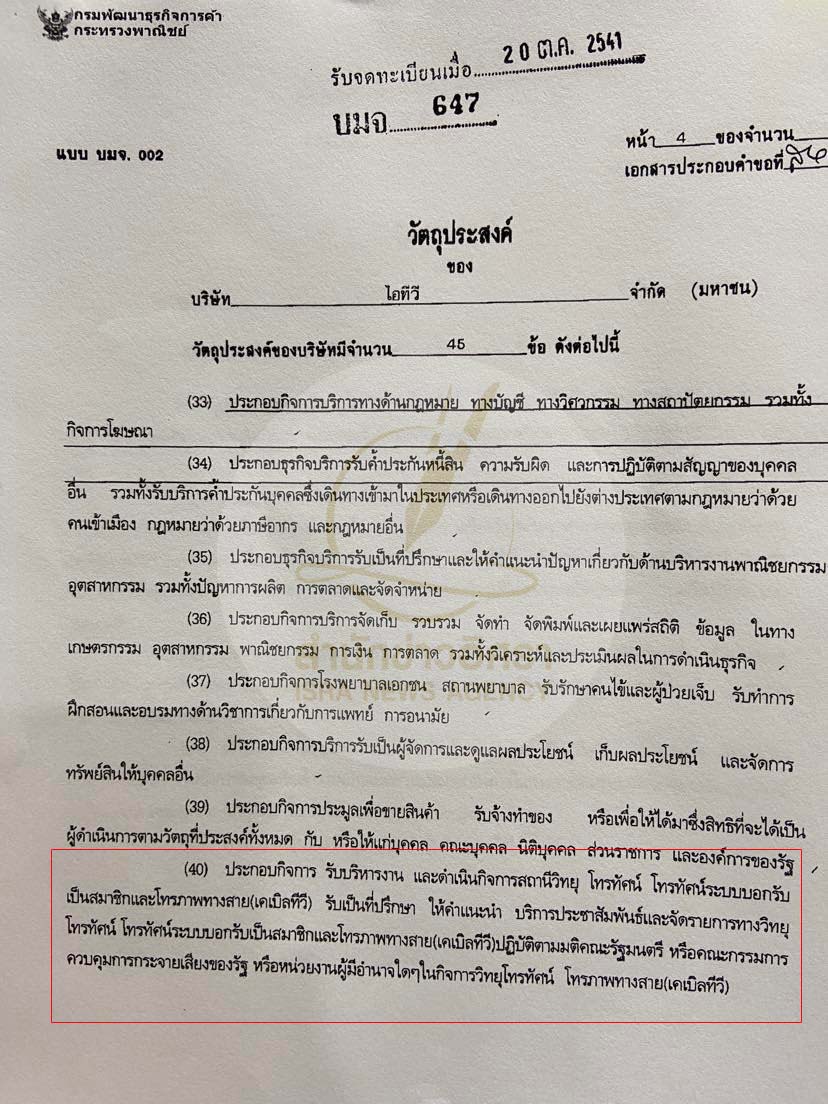 ข้อ (40) ประกอบกิจการ รับบริหารและดำเนินกิจการสถานีวิทยุ โทรทัศน์ โทรทัศน์ระบบบอกรับเป็นสมาชิกและโทรภาพทางสาย(เคเบิลทีวี) รับเป็นที่ปรึกษา ให้คำแนะนำ บริการประชาสัมพันธ์และจัดรายการทางวิทยุโทรทัศน์ โทรทัศน์ระบบบอกรับเป็นสมาชิกและโทรภาพทางสาย (เคเบิลทีวี) ปฏิบัติตามมติคณะรัฐมนตรี หรือคณะกรรมการควบคุมการกระจายเสียงของรัฐ หรือหน่วยงานผู้มีอำนาจใดๆในกิจการวิทยุโทรทัศน์ โทรภาพทางสาย(เคเบิลทีวี)