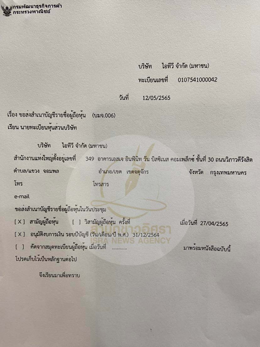 6.ข้อมูลบริษัทย่อย - บริษัท อาร์ตแวร์ มีเดีย จำกัด จดทะเบียนวันที่ 11 พ.ย. 2545 ทุน 25 ล้านบาท ที่ตั้งเลขที่ 87 อาคารเอ็มไทย ทาวเวอร์ ชั้น 27 ถนนวิทยุ แขวงลุมพินี เขตปทุมวัน กรุงเทพมหานคร บัญชีรายชื่อผ็ถือหุ้น ณ วันที่ประชุมผู้ถือหุ้น 29 เม.ย.2565 บริษัท ไอทีวี จำกัด (มหาชน) ถือ 249,993 หุ้น จากจำนวนทั้งหมด 250,000 หุ้น มูลค่าหุ้นละ 100 บาท งบการเงินรอบปีสิ้นสุด 31 ธ.ค.2564 งบกำไรขาดทุน รายได้รวม 701 บาท ขาดทุนสุทธิ 49,379 บาท งบดุล สินทรัพย์รวม 511,589 บาท หนี้สิน 17,163 บาท ขาดทุนสะสม 24,505,574 บาท