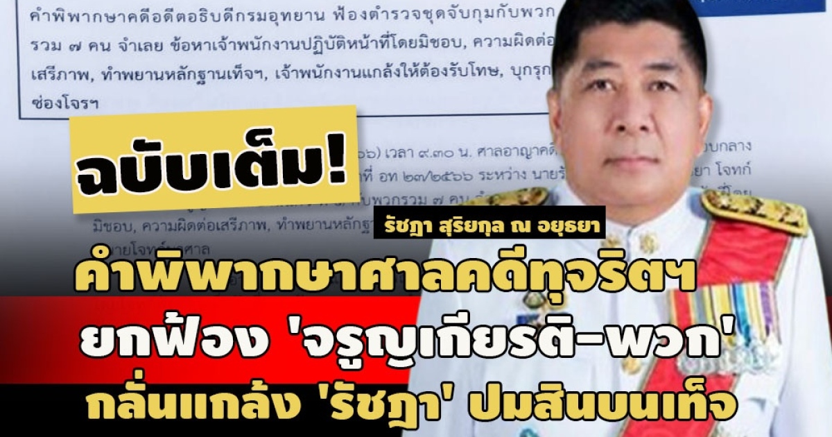 สำนักข่าวอิศรา (www.isranews.org) รายงานไปแล้วว่า เมื่อวันที่ 30 พ.ค. 2566 ศาลอาญาคดีทุจริตและประพฤติมิชอบกลาง มีคำพิพากษายกฟ้อง ในคดีหมายเลขดำที่ อท 23/2566 ที่ นายรัชฎา สุริยกุล ณ อยุธยา อดีตอธิบดีกรมอุทยานแห่งชาติ สัตว์ป่า และพันธุ์พืช เป็นโจทก์ ยื่นฟ้อง พล.ต.ต.จรูญเกียรติ ปานแก้ว ผบก.ปปป. พร้อมด้วยนายชัยวัฒน์ กับพวกรวม 7 คน เป็นจำเลยในความผิดฐานเป็นเจ้าพนักงานปฏิบัติหน้าที่โดยมิชอบ, ความผิดต่อเสรีภาพ, ทำพยานหลักฐานเท็จฯ, เจ้าพนักงานกลั่นแกล้งให้ต้องรับโทษ, บุกรุก, ซ่องโจรฯ พ.ร.บ.คุ้มครองข้อมูลส่วนบุคคล พ.ศ. 2562