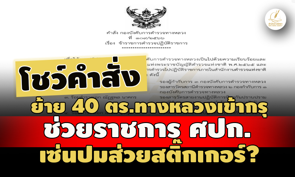 จากกรณีปรากฏข่าวว่า เมื่อวันที่ 9 มิ.ย. 2566 พล.ต.ต.จรูญเกียรติ ปานแก้ว ผู้บังคับการตำรวจป้องกันปราบปรามการทุจริตและประพฤติมิชอบ (ผบก.ปปป.) รักษาราชการแทน ผู้บังคับการตำรวจทางหลวง (ผบก.ทล.) ได้ลงนามคำสั่งโยกย้ายข้าราชการตำรวจทางหลวง ที่ต้องสงสัยว่ามีส่วนเกี่ยวข้องกับคดีส่วยสติ๊กเกอร์รถบรรทุก จำนวน 40 นาย ประกอบด้วย รอง ผกก. รอง สว. และ เจ้าหน้าที่ระดับชั้นประทวนให้ไปปฏิบัติหน้าที่ช่วยราชการที่ ศูนย์ปฏิบัติการตำรวจทางหลวง (ศปก.บก.ทล.) ก่อนจนกว่าจะมีคำสั่งเปลี่ยนแปลง
