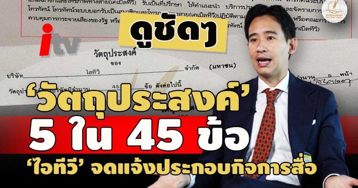 เปิดข้อมูล ดูชัด ๆ วัตถุประสงค์ 45 ข้อ บ.ไอทีวี ตอนจดจัดตั้ง 5 ข้อเกี่ยวข้องประกอบกิจการสื่อ หลังออกหนังสือแจงปมเผยแพร่คลิปขัดแย้งงบการเงิน ยันสถานะ ยังคงดำเนินการภายใต้วัตถุประสงค์ที่ได้จดทะเบียนกรมพัฒนาธุรกิจการค้า มิได้มีการเลิกกิจการ