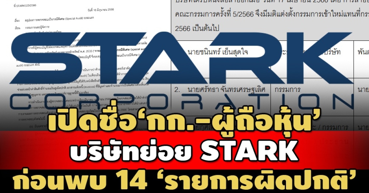 ทั้งหมดนี้เป็นสรุปรายละเอียดเกี่ยวกับรายชื่อ ‘ผู้ถือหุ้น-กรรมการ’ และลักษณะการประกอบธุรกิจของ STARK และบริษัทย่อย รวมถึงบริษัทที่เกี่ยวข้อง ก่อนที่ ‘ผู้สอบบัญชี’ จะตรวจสอบพบ ‘รายการผิดปกติ’ จำนวน 14 รายการ อันเป็นสาระสำคัญซึ่งมีผลกระทบต่องบการเงินรวมของกลุ่มกิจการ STARK!