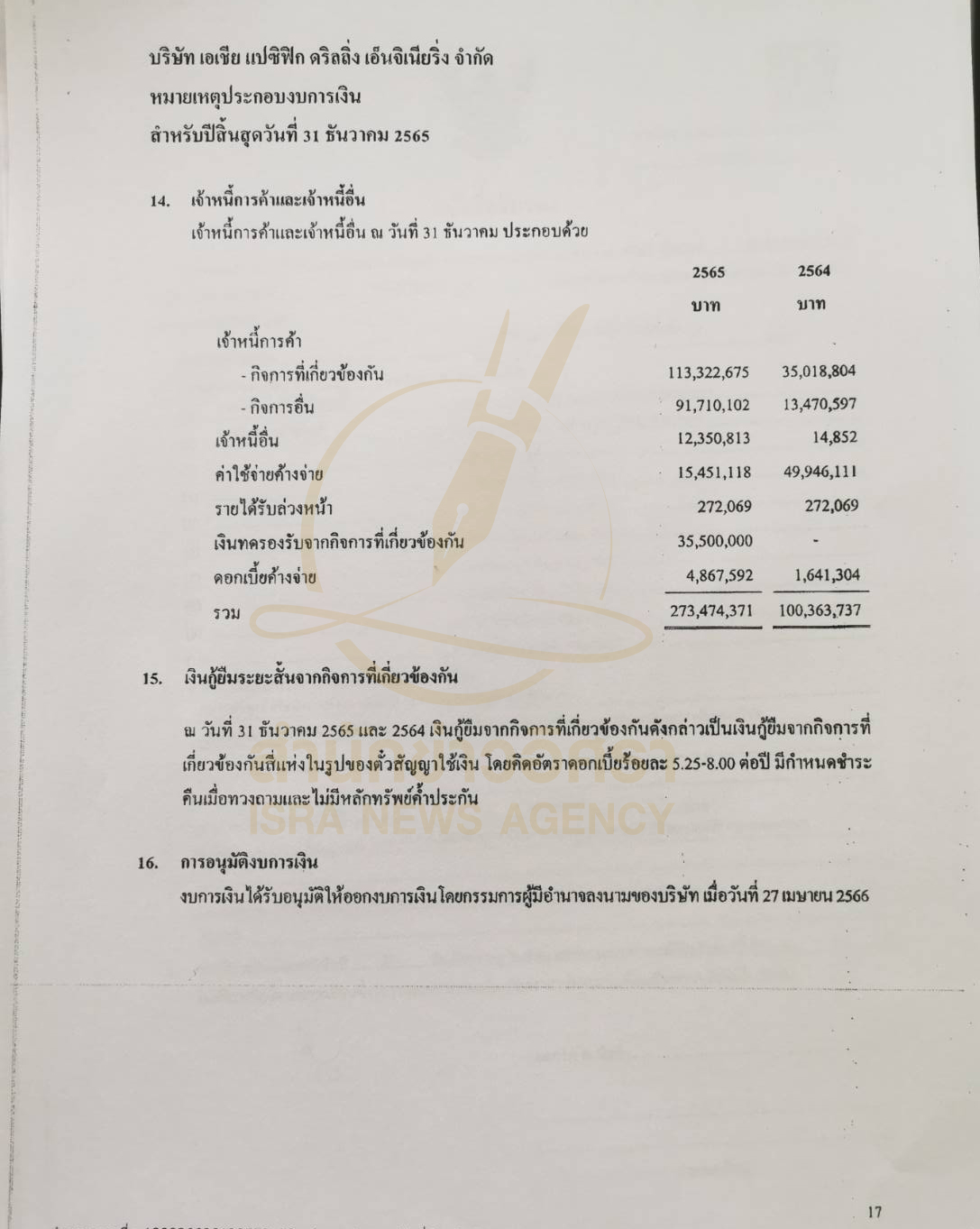 นอกจากนี้ เมื่อพิจารณาใน ‘หมายเหตุประกอบงบการเงิน’ ของ APDE ใน ‘รายการเจ้าหนี้การค้าและเจ้าหนี้อื่น’ ณ วันที่ 31 ธ.ค.2565 พบว่า บริษัทฯมีรายการ ‘รายได้รับล่วงหน้า’ จำนวน 272,069 บาท เท่านั้น และมีรายการ ‘เงินทดรองรับจากกิจการที่เกี่ยวข้องกัน’ จำนวน 35.5 ล้านบาท (อ่านข้อมูลประกอบด้านล่าง)