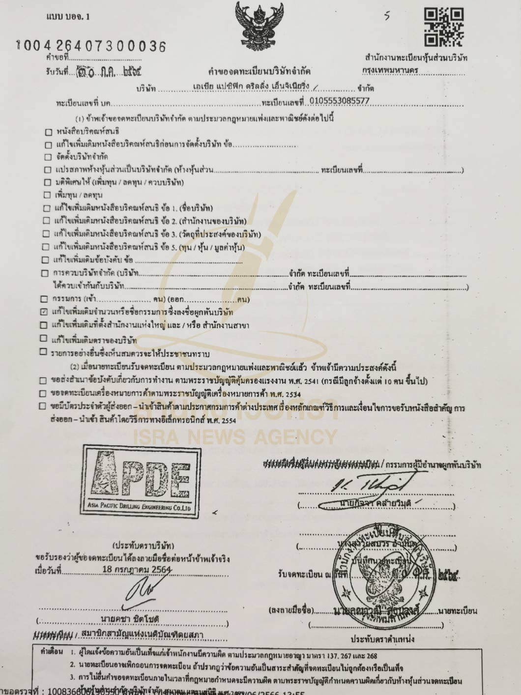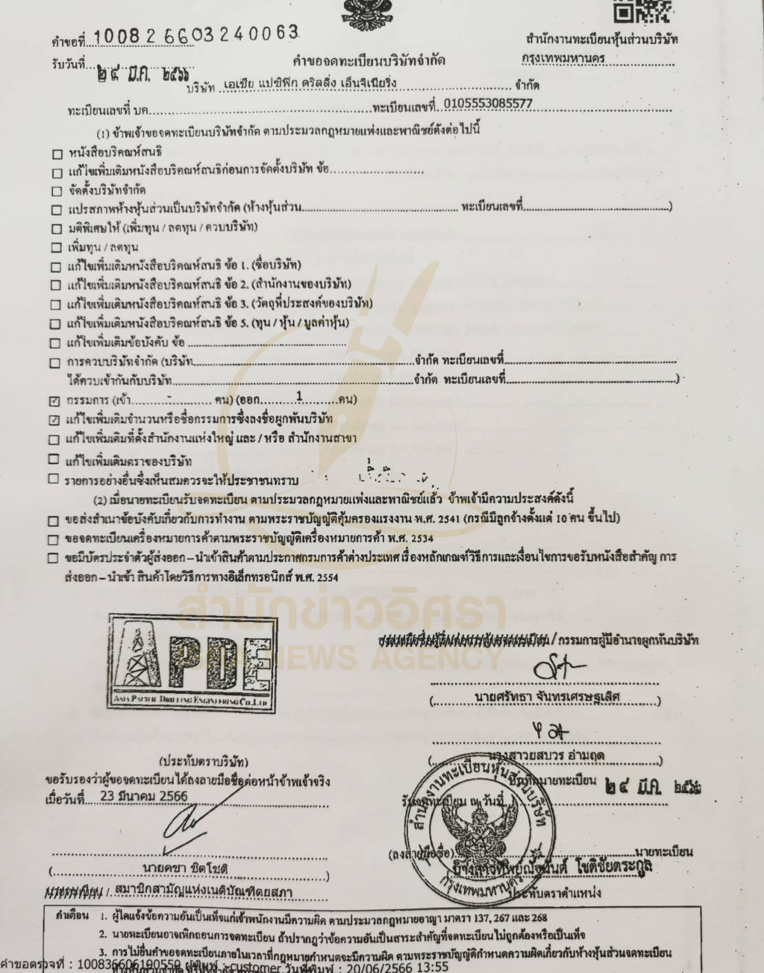ทั้งนี้ ในช่วงปี 2564-2566 (30 ก.ค.2564-8 พ.ค.2566) บริษัท เอเชีย แปซิฟิก ดริลลิ่ง เอ็นจิเนียริ่ง จำกัด (APDE) ได้นำส่งแบบ อบจ.1 (คำขอจดทะเบียนบริษัทจำกัด) กรณีการเปลี่ยนแปลงกรรมการ และแก้ไขเพิ่มเติมจำนวนหรือกรรมการซึ่งลงชื่อผูกพันบริษัท APDE ดังนี้
