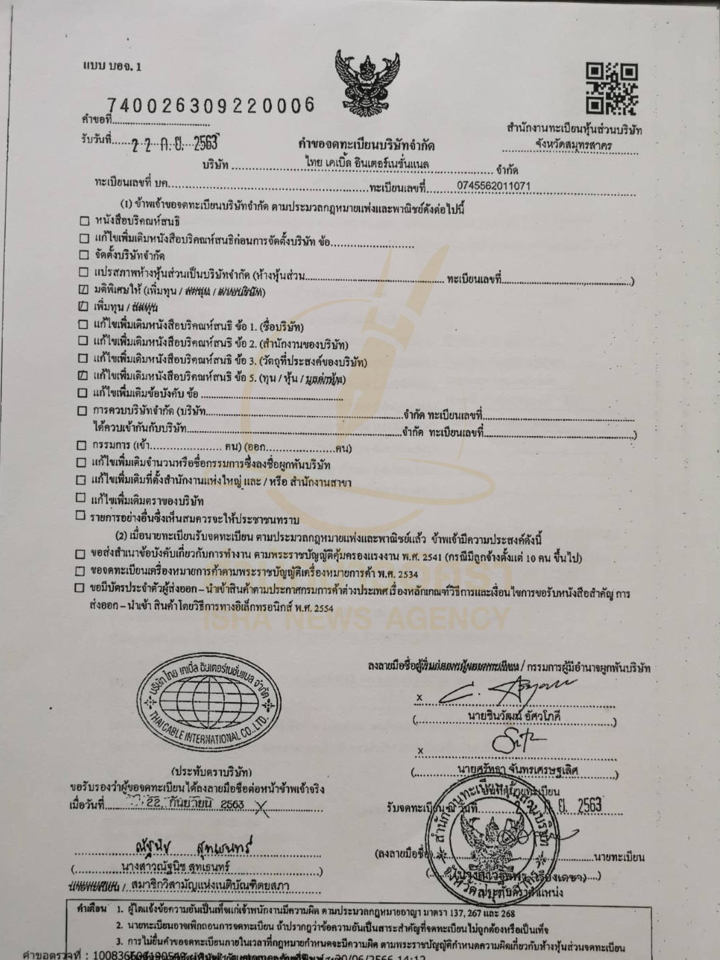เมื่อวันที่ 22 ก.ย.2563 สำนักงานทะเบียนหุ้นส่วนบริษัท จังหวัดสมุทรสาคร รับแบบรายการ บอจ.1 (คําขอจดทะเบียนบริษัทจำกัด) ของ ไทยเคเบิ้ล ซึ่งได้ยื่นแก้ไขเพิ่มเติมหนังสือบริคณห์สนธิข้อ 5 (ทุน/หุ้น) แจ้งมติพิเศษให้เพิ่มทุน และแจ้งการเพิ่มทุนบริษัทฯ โดยปรากฏรายชื่อกรรมการและกรรมการซึ่งลงชื่อผูกพันบริษัท ดังนี้