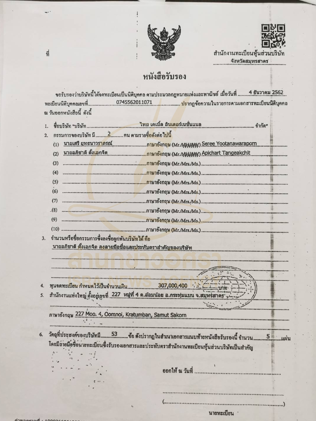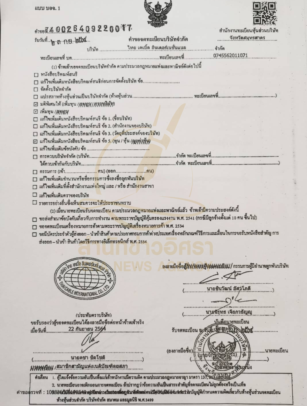 เมื่อวันที่ 23 ก.ย.2564 สำนักงานทะเบียนหุ้นส่วนบริษัท จังหวัดสมุทรสาคร รับแบบรายการ บอจ.1 (คําขอจดทะเบียนบริษัทจำกัด) ของ ไทยเคเบิ้ล ซึ่งได้ยื่นแก้ไขเพิ่มเติมหนังสือบริคณห์สนธิข้อ 5 (ทุน/หุ้น) แจ้งมติพิเศษให้เพิ่มทุน และแจ้งการเพิ่มทุนบริษัทฯ ปรากฏรายชื่อกรรมการและกรรมการซึ่งลงชื่อผูกพันบริษัท ดังนี้