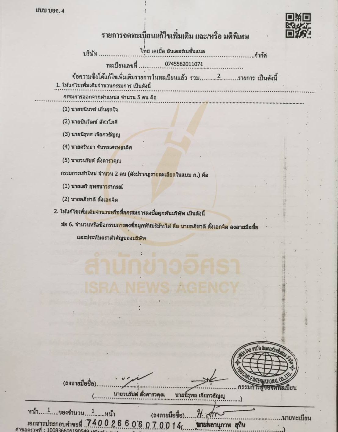สำนักข่าวอิศรา (www.isranews.org) ได้ตรวจสอบรายชื่อของ ‘กรรมการ’ และ ‘กรรมการซึ่งลงชื่อผูกพันบริษัท’ ของ ไทยเคเบิ้ล ในช่วงปี 2563-2566 (22 ก.ย.2563-7 มิ.ย.2566) ผ่านแบบ บอจ. 1 (คำขอจดทะเบียนบริษัทจำกัด) ที่บริษัทฯ ได้ยื่นต่อสำนักงานทำเบียนหุ้นส่วนบริษัท กรมพัฒนาธุรกิจการค้า พบรายละเอียดที่น่าสนใจ ดังนี้