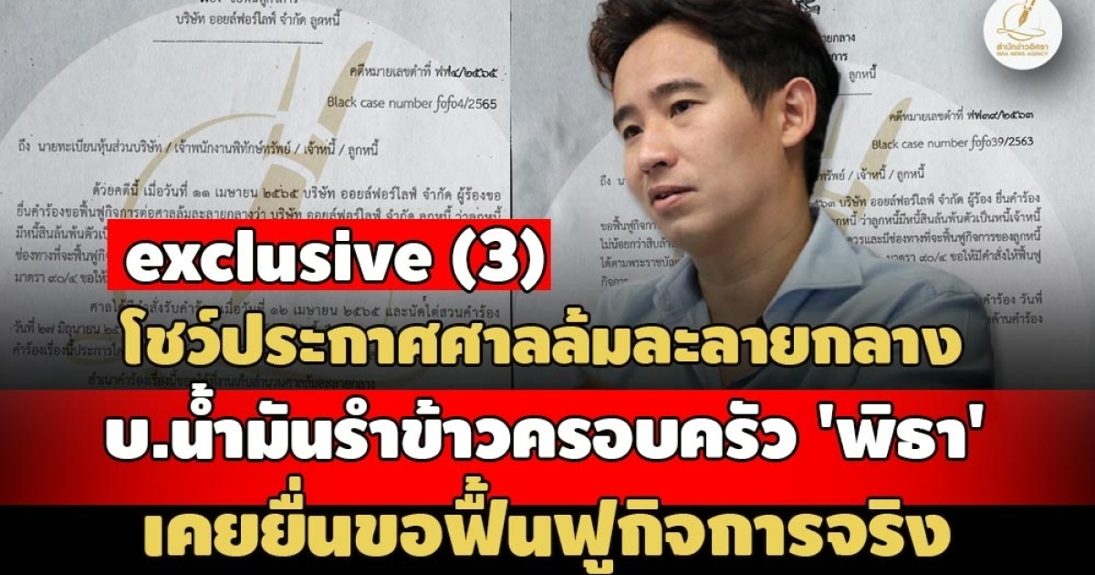 "...ในประกาศศาลล้มละลายกลางทั้ง 2 ฉบับ ระบุข้อมูลว่า บริษัท ออยล์ฟอร์ไลฟ์ จำกัด ผู้ร้องขอยื่นคำร้องขอฟื้นฟูกิจการต่อศาลล้มละลายกลาง มีหนี้สินล้นพันตัวเป็นหนี้เจ้าหนี้ไม่น้อยกว่าสิบล้านบาท แต่กิจการของลูกหนี้ยังมีเหตุอันสมควร และมีช่องทางที่จะฟื้นฟูกิจการได้..."