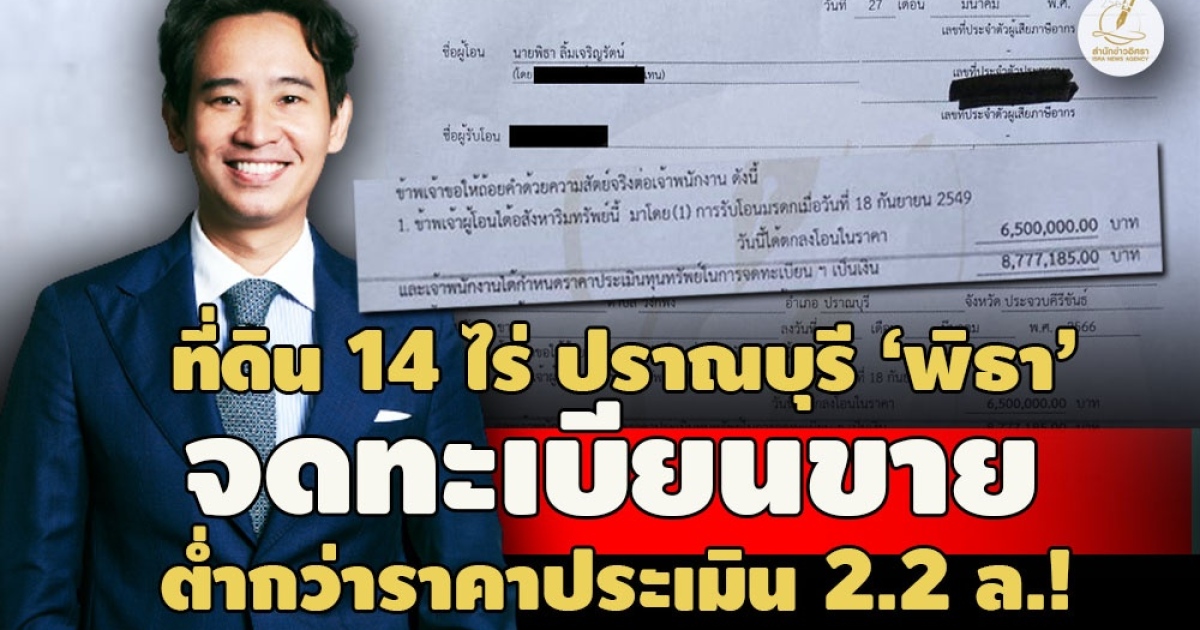 เปิดข้อมูลสุดลึก! บันทึกถ้อยคำ ปมที่ดินมรดก 14 ไร่ อ.ปราณบุรี จ.ประจวบคีรีขันธ์ ‘พิธา ลิ้มเจริญรัตน์’ แจ้ง ป.ป.ช.มูลค่า 18 ล. จดทะเบียนขาย 6.5 ล. เจ้าพนักงานกำหนดราคาประเมินอยู่ที่ 8,777,185 บาท เท่ากับขายต่ำกว่าประเมิน 2.2 ล. ลงนามรับรอง ชำระภาษีเรียบร้อย