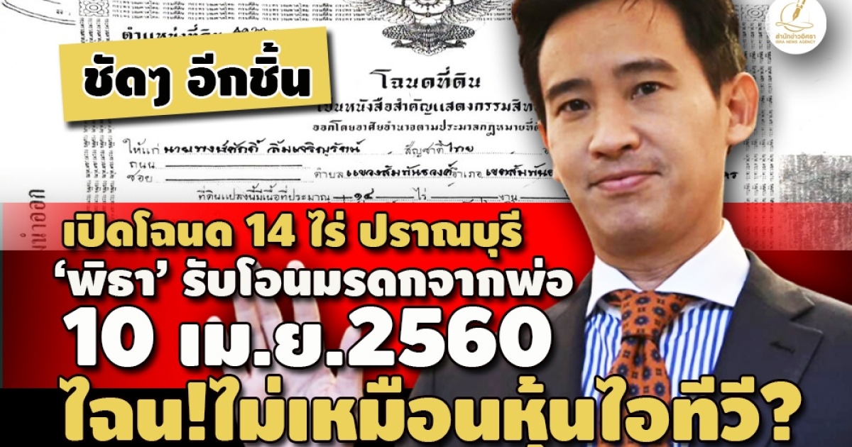 ในหนังสือสัญญาขายที่ดิน (ท.ด.13) ฉบับวันที่ 27 มี.ค.2566 นายพิธา ‘ผู้ขาย’ ระบุว่า (ข้อ 4 ) ได้ที่ดินมาโดยการรับโอนมรดก เมื่อวันที่ 18 กันยายน 2549 (วันที่นายพงษ์ศักดิ์ ลิ้มเจริญรัตน์ บิดาเสียชีวิต) สอดคล้องกับ บันทึกถ้อยคำการชำระภาษีอากร (ท.ด.16) ข้อ 1 ระบุ นายพิธา ‘ผู้โอน’ได้อสังหาริมทรัพย์นี้มาโดยการรับโอนมรดกเมื่อวันที่ 18 กันยายน 2549