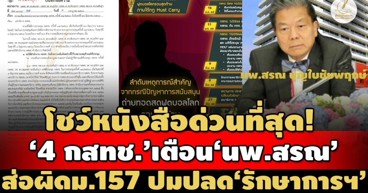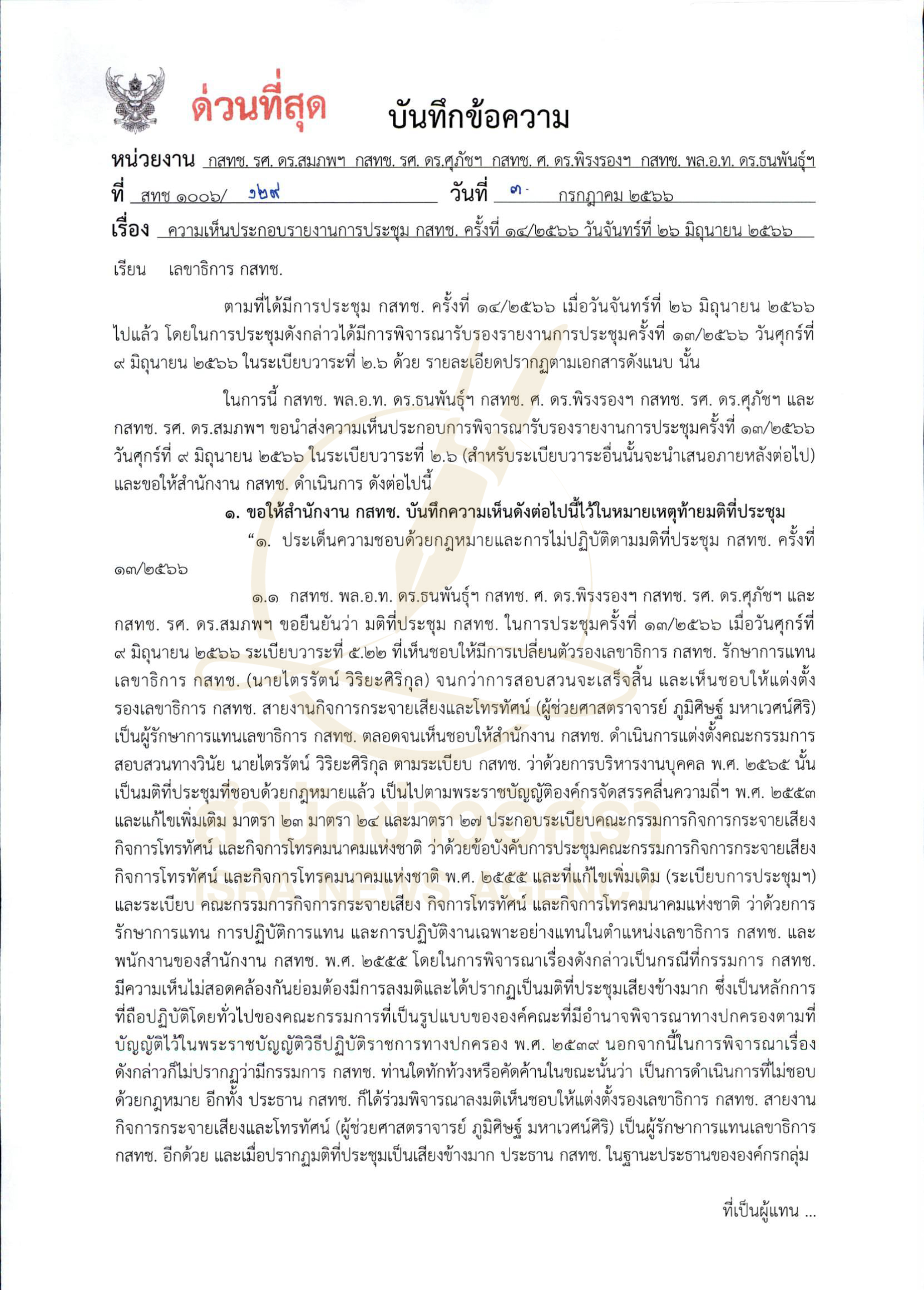 สำนักข่าวอิศรา (www.isranews.org) รายงานว่า เมื่อวันที่ 3 ก.ค.2566กรรมการ กสทช. 4 คน ได้แก่ พล.อ.ท.ดร.ธนพันธุ์ หร่ายเจริญ ,รศ.ดร.พิรงรอง รามสูต ,รศ.ดร.ศุภัช ศุภชลาศัย และ รศ.ดร.สมภพ ภูริวิกรัยพงศ์ ส่งหนังสือด่วนที่สุด ที่ สทช.1006/129 เรื่อง ‘ความเห็นประกอบการรายงานการประชุม กสทช. ครั้งที่ 14/2566 วันจันทร์ที่ 26 มิ.ย.2566’ ถึงเลขาธิการ กสทช. โดยมีเนื้อหา ดังนี้