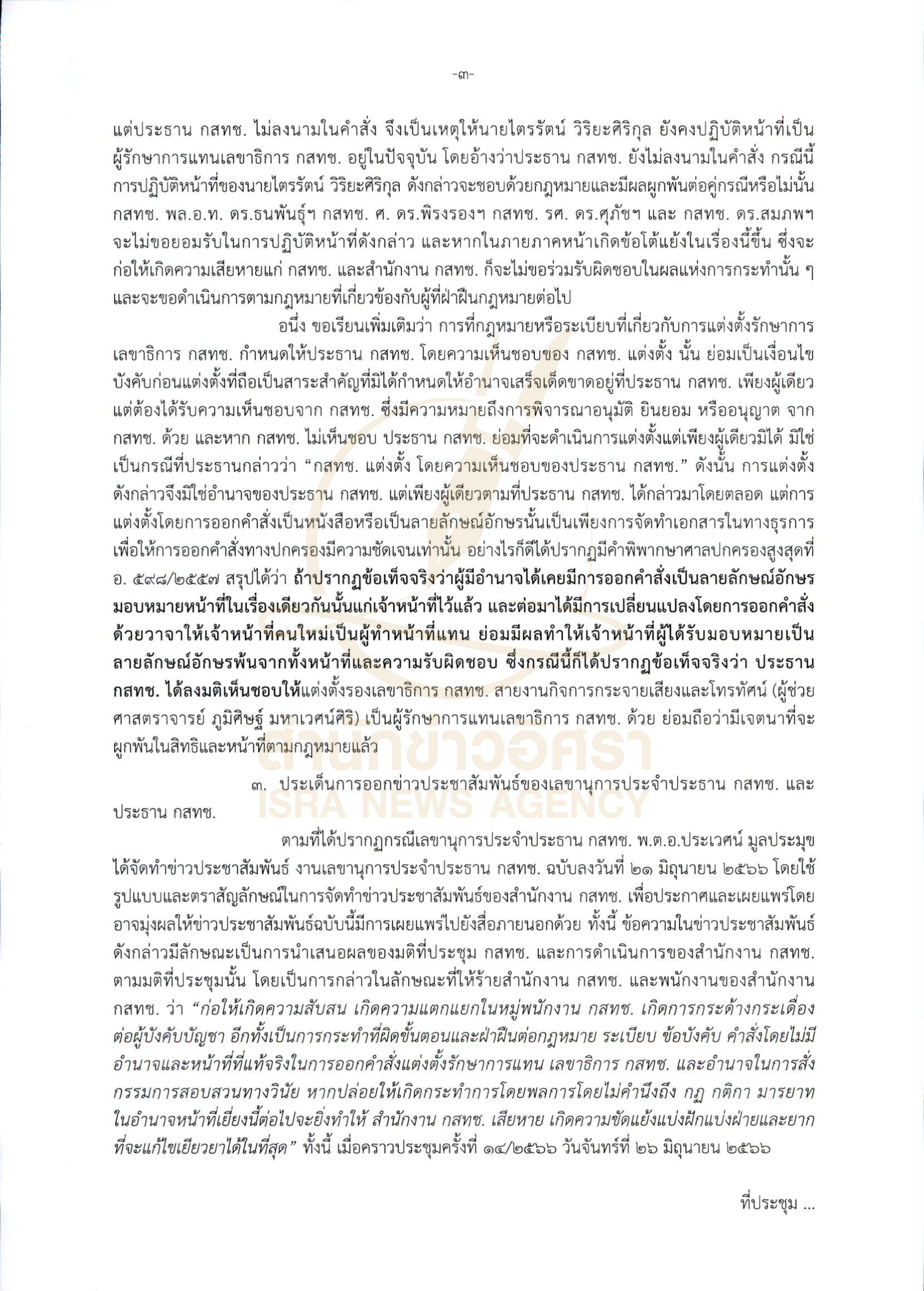 26 มิ.ย.2566 ที่ประชุม กสทช. ครั้งที่ 14/2566 ประธาน กสทช. ยืนยันยังไม่ลงนามคำสั่งเปลี่ยนตัวรักษาการเลขาธิการ กสทช. ตามมติที่ประชุม กสทช. ครั้งที่ 13/2566 กสทช. เสียงข้างมากสงวนสิทธิ์หากเกิดความเสียหายเพื่อให้การทำหน้าที่ดำเนินต่อไปได้