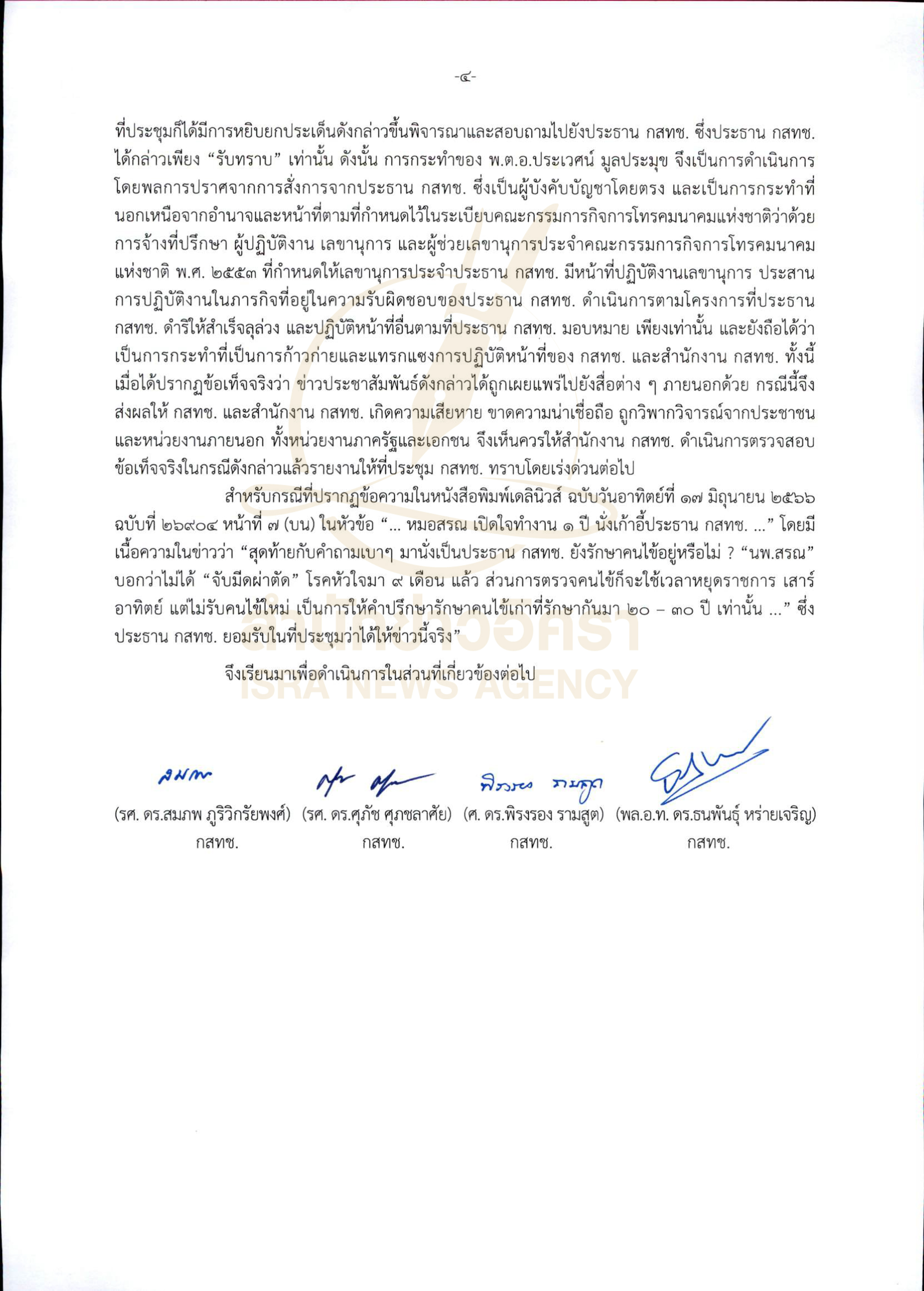 สำหรับกรณีที่ปรากฎข้อความในหนังสือพิมพ์เดลินิวส์ ฉบับวันอาทิตย์ที่ 17 มิถุนายน 2566 ฉบับที่ 26904 หน้าที่ 7 (บน) ในหัวข้อ “... หมอสรณ เปิดใจทำงาน 1 ปี นั่งเก้าอี้ประธาน กสทช....” โดยมีเนื้อความในข่าวว่า “สุดท้ายกับคำถามเบาๆ มานั่งเป็นประธาน กสทช. ยังรักษาคนไข้อยู่หรือไม่ ?