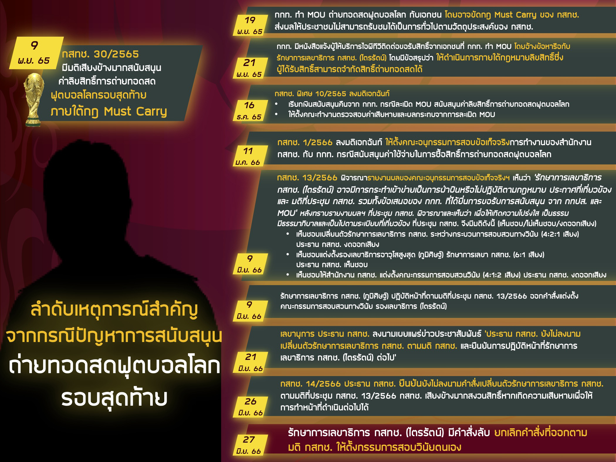 9 พ.ย.2565 ที่ประชุม กสทช. ครั้งที่ 30/2565 มีมติเสียงข้างมากสนับสนุนค่าลิขสิทธิ์การถ่ายทอดสดฟุตบอลโลกรอบสุดท้ายภายใต้กฎ Must Carry