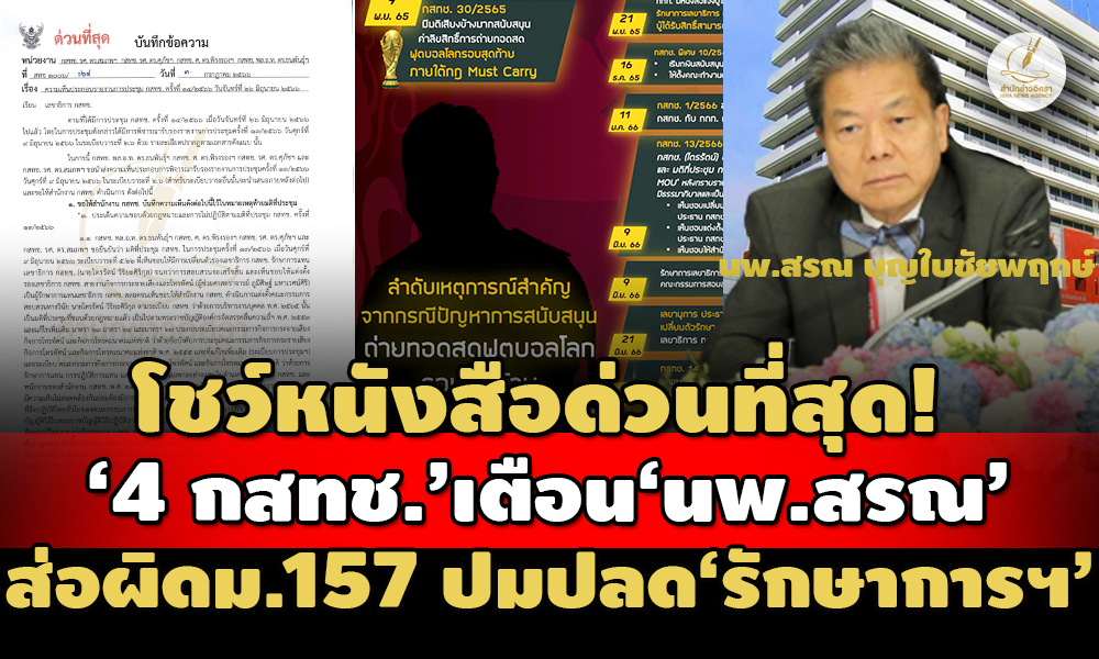 ทั้งหมดนี้รายละเอียดหนังสือเรื่อง ‘ความเห็นประกอบการรายงานการประชุม กสทช. ครั้งที่ 14/2566 วันจันทร์ที่ 26 มิ.ย.2566’ ของกรรมการ กสทช. 4 ราย ซึ่งส่งสัญญาณเตือนไป ‘ศ.คลินิก นพ.สรณ บุญใบชัยพฤกษ์’ ประธาน กสทช. ให้ต้องปฏิบัติตามมติบอร์ด กสทช. เมื่อวันที่ 9 มิ.ย.2566 รวมถึง 'ไทม์ไลน์' ปัญหาค่าลิขสิทธิ์ ‘บอลโลก’ อันเป็นต้นเหตุของเรื่องนี้!