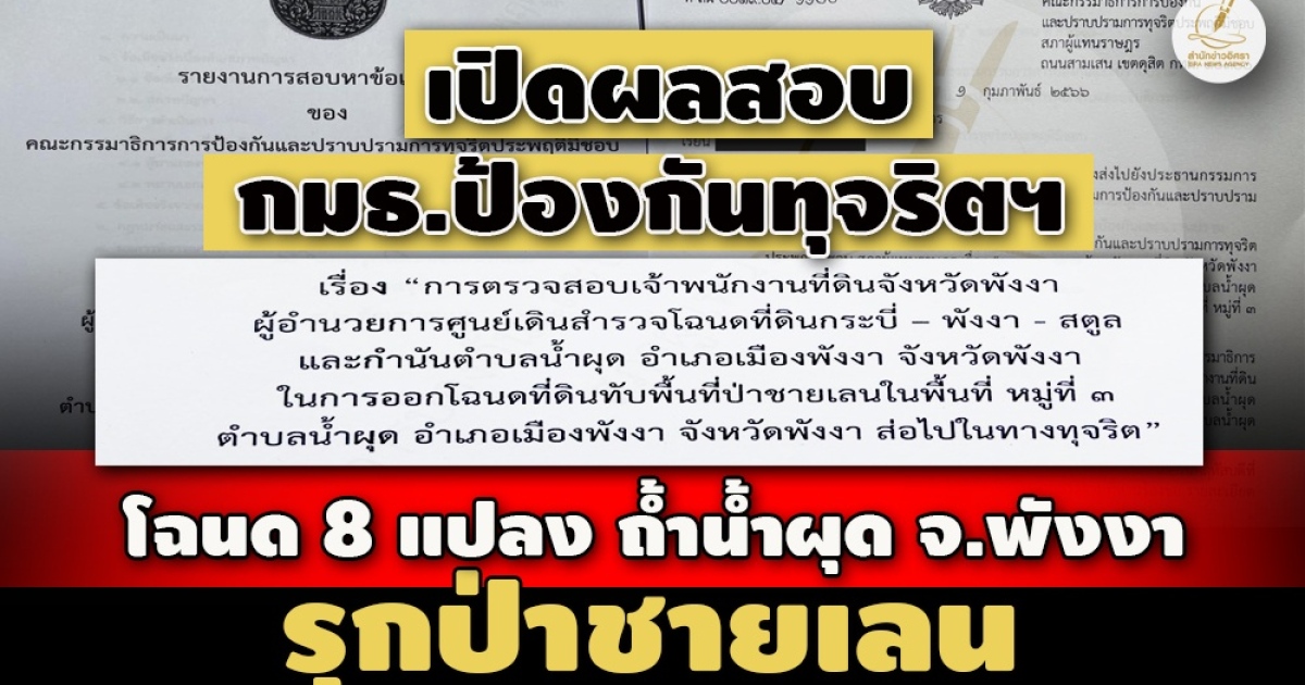 อีก 1 ชุด! เปิดรายงาน กมธ.ป้องกันทุจริต สภาฯ ชี้ชัด โฉนด 8 แปลง ถ้ำน้ำผุด ม.3 จ.พังงาออกมิชอบ เอาพิกัดที่ตั้งที่ดินนอกเขตไปสอบถามให้ยืนยันไม่อยู่ในเขตป่าฯ ซ้ำแบ่งขายให้ ก.คลังด้วย ส่งเรื่อง ป.ป.ช. ปปง. ชี้มูล 5 จนท. 1 เอกชน พ่วง คกก.ป้องกันและหยุดยั้งการบุกรุกที่ดินฯ ฐานละเว้น - ชงอธิบดีกรมที่ดินเพิกถอน