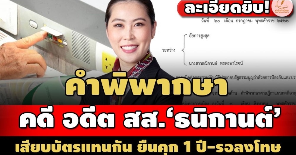 (ข่าวเกี่ยวข้อง: ถอนสิทธิสมัครเลือกตั้งตลอดไป! ศาลฎีกาลงโทษ'ธณิกานต์' อดีตสส.พปชร.คดีจริยธรรมเสียบบัตรแทน,ปิดฉากชีวิตการเมือง! ฉบับเต็มคำพิพากษาศาลฎีกาลงโทษ 'ธณิกานต์' คดีจริยธรรมเสียบบัตรแทน )