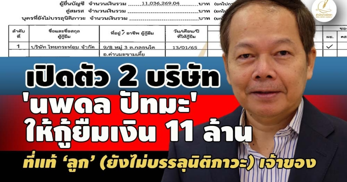 น่าสนใจว่า บริษัท ไทยกระท่อม จำกัด และบริษัท อิสานา ฟู้ดส์ จำกัด มีที่มาที่ไปอย่างไร? ทำไม นาย นพดล ปัทมะ ถึงยอมให้กู้ยืมเงินวงเงินหลายล้านบาท?