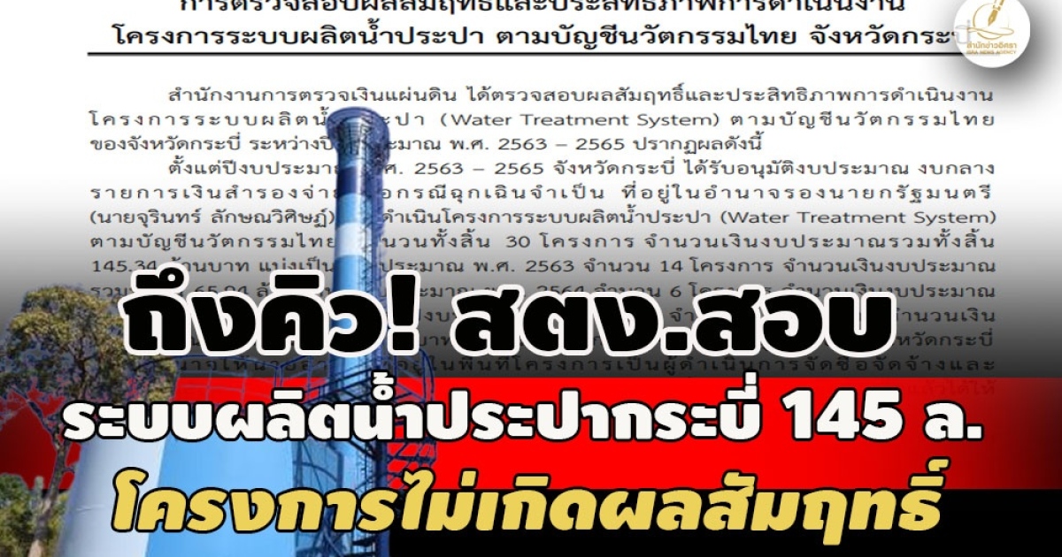 เหล่านี้ คือ รายละเอียดผลการดำเนินงานโครงการระบบผลิตน้ำประปา ตามบัญชีนวัตกรรมไทย จังหวัดกระบี่ ที่ได้รับอนุมัติงบประมาณ งบกลางรายการเงินสำรองจ่ายเพื่อกรณีฉุกเฉินจำเป็น ที่อยู่ในอำนาจรองนายกรัฐมนตรี(นายจุรินทร์ ลักษณวิศิษฎ์) เพื่อดำเนินโครงการระบบผลิตน้ำประปา (Water Treatment System) ตามบัญชีนวัตกรรมไทย จำนวนทั้งสิ้น 30 โครงการ จำนวนเงินงบประมาณรวมทั้งสิ้น 145.34 ล้านบาท ที่ถูก สตง. ตรวจสอบพบปัญหาการควบคุมและดูแลพัสดุขาดประสิทธิภาพ โครงการไม่เกิดผลสัมฤทธิ์ตามวัตถุประสงค์และเป้าหมายที่กำหนด