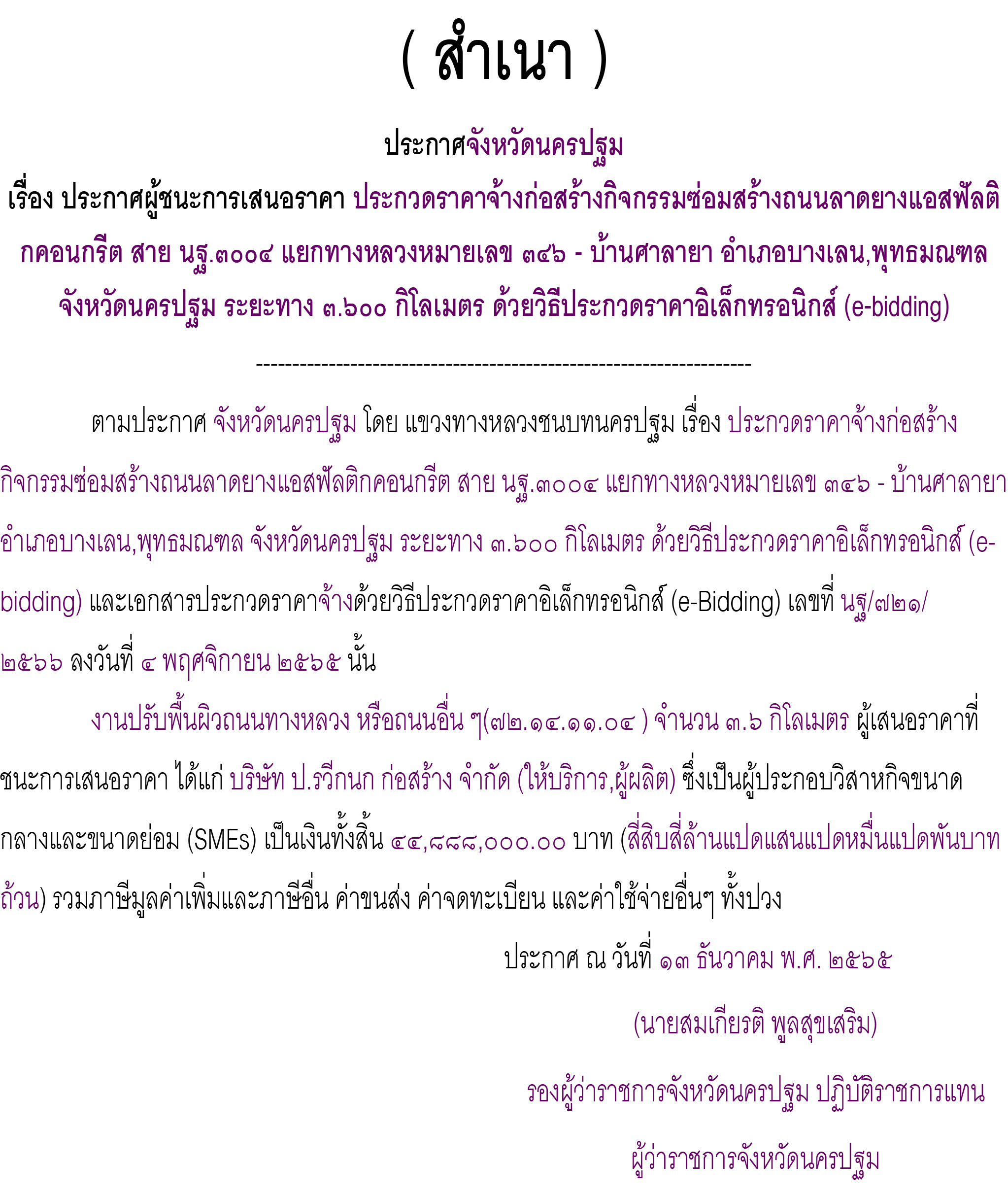 4 พ.ย.2565 นายสมเกียรติ พูลสุขเสริม รองผู้ว่าราชการจังหวัดนครปฐม ปฏิบัติราชการแทน ผู้ว่าราชการจังหวัดนครปฐม ออกประกาศจังหวัดนครปฐม โดย แขวงทางหลวงชนบทนครปฐม เรื่อง ประกวดราคาจ้างก่อสร้างกิจกรรมซ่อมสร้างถนนลาดยางแอสฟัลติกคอนกรีต สาย นฐ.3004 แยกทางหลวงหมายเลข 346 - บ้านศาลายา อำเภอบางเลน,พุทธมณฑล จังหวัดนครปฐม ระยะทาง 3.600 กิโลเมตร ด้วยวิธีประกวดราคาอิเล็กทรอนิกส์ (e-bidding) ราคากลาง 45,000,523.21 บาท กำหนดให้ผู้ยื่นข้อเสนอต้องยื่นข้อเสนอและเสนอราคาทางระบบจัดซื้อจัดจ้างภาครัฐด้วยอิเล็กทรอนิกส์ ในวันที่ 23 พฤศจิกายน 2565