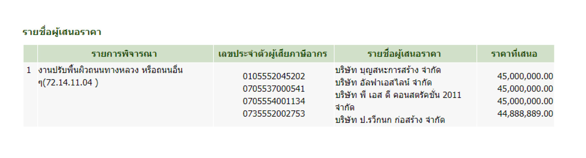 ผู้ยื่นเสนอราคา 4 ราย ในจำนวนนี้เสนอราคาเท่ากัน 3 ราย ได้แก่ บริษัท บุญสหะการสร้าง จำกัด บริษัท อัลฟาเอสไลน์ จำกัด และ บริษัท พี เอส ดี คอนสตรัคชั่น 2011 จำกัด เสนอราคาเท่ากันที่ 45 ล้านบาท ขณะที่ บริษัท ป.รวีกนก ก่อสร้าง จำกัด เสนอราคา 44,888,889 บาท เป็นผู้เสนอราคาต่ำสุด (ดูเอกสาร)