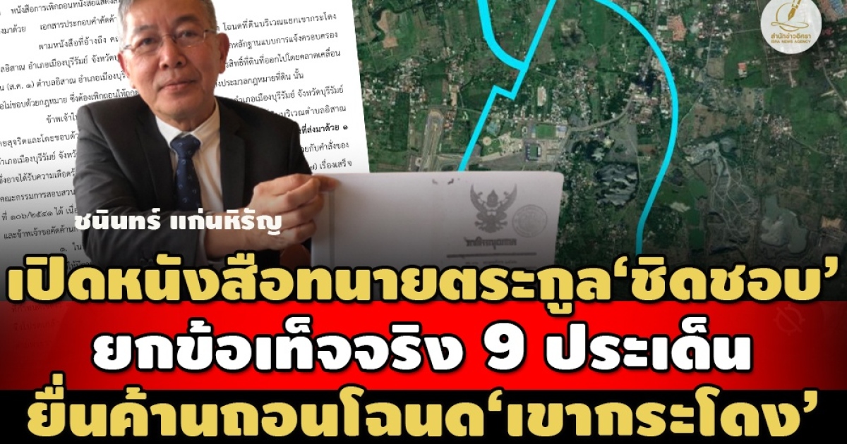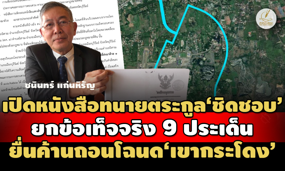 เหล่านี้เป็นรายละเอียดของหนังสือคัดค้านการเพิกถอน ‘โฉนดที่ดิน’ และเอกสารสิทธิในที่ดินต่างๆ ที่ทนายความตระกูล ‘ชิดชอบ’ และผู้ที่ได้รับความเดือดร้อน ยื่นต่อคณะกรรมการสอบสวน โดยหยิบยกข้อเท็จจริงใน 9 ประเด็น มาคัดค้านการเพิกถอนเอกสารสิทธิในที่ดินบริเวณแยกเขากระโดง จ.บุรีรัมย์ในครั้งนี้