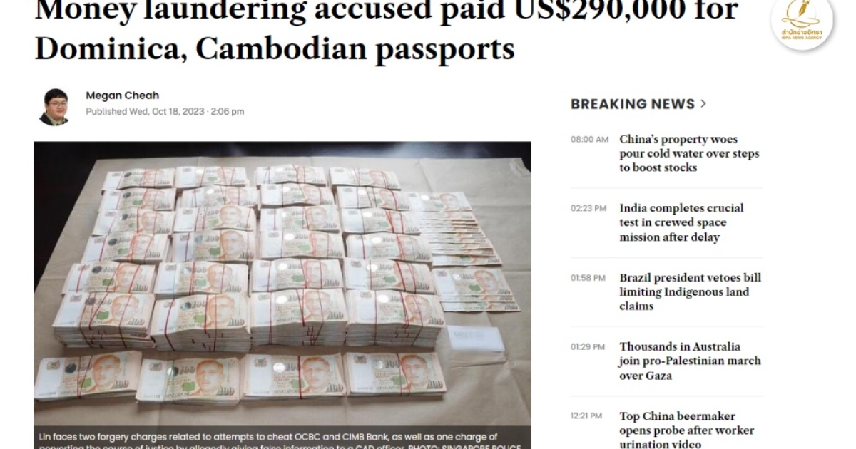 โดยสื่อในประเทศสิงคโปร์ได้รายงานข่าวกรณีที่นางหลิน เป่าหยิง หนึ่งในกลุ่มผู้ต้องหาชาวจีนซึ่งถูกจับกุมเมื่อเดือน ส.ค. ด้วยข้อกล่าวหาว่าดำเนินการฟอกเงินกว่า 2.8 พันล้านดอลลาร์สิงคโปร์ (74,393,475,604 บาท) ล่าสุดเมื่อวันที่ 18 ต.ค. อัยการสอบสวนได้กล่าวในศาลว่าจากการตรวจสอบพบว่าเธอได้จ่ายเงินกว่า 290,000 ดอลลาร์สหรัฐฯ (10,582,100 บาท) เพื่อให้ได้มาซึ่งหนังสือเดินทางของทั้งประเทศกัมพูชาและประเทศโดมินิกา
