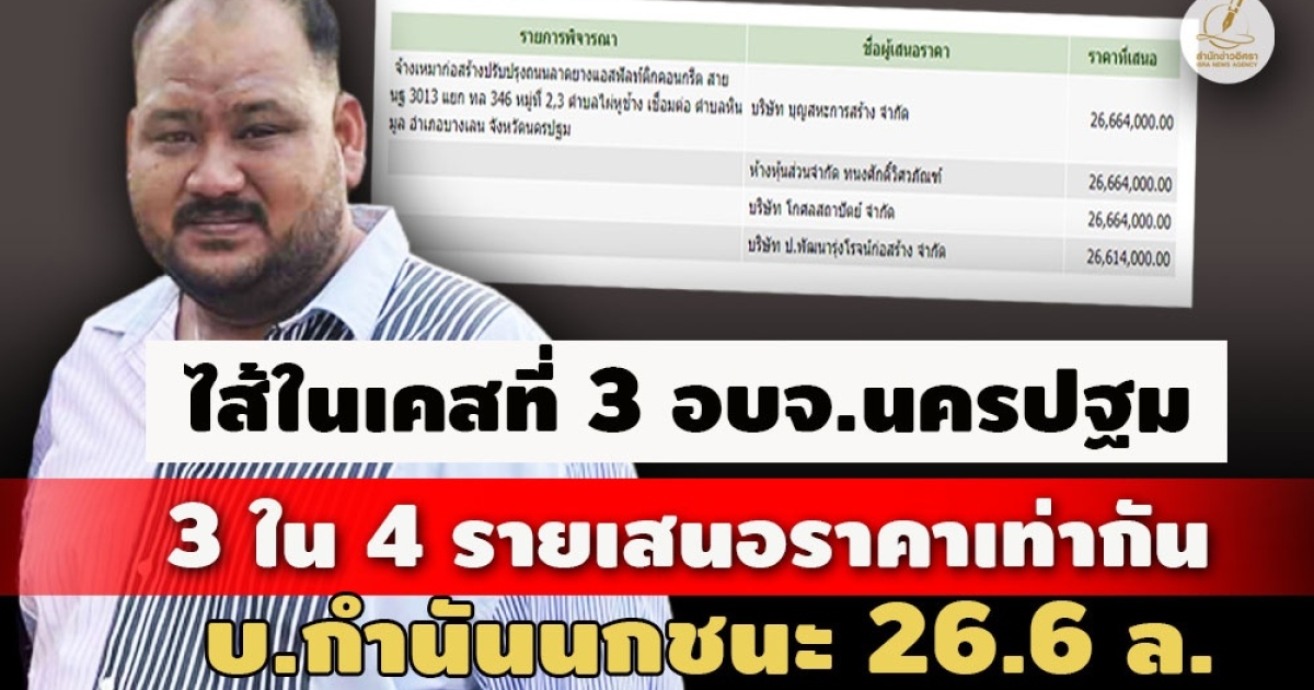 - อบจ.นครปฐมอีกแล้ว! ‘คู่เทียบ’ 3 ใน 4 รายเสนอราคาเท่ากัน บ.กำนันนก คว้า 27.9 ล.