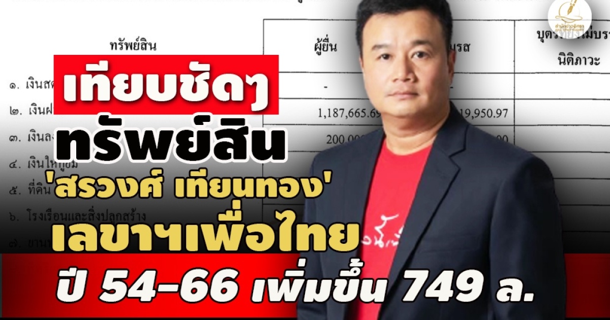 "...เปิดแฟ้มย้อนดูทรัพย์สิน 'สรวงศ์ เทียนทอง' สส.สระแก้ว - เลขาฯ เพื่อไทย ตอนยื่นรับตำแหน่ง สส. สมัยรัฐบาล น.ส.ยิ่งลักษณ์ ปี 2554 แจ้ง ป.ป.ช. 183.5 ล. เทียบล่าสุดปี 2566 มี 932.6 ล. ผ่าน 12 ปี เพิ่มกว่า 749 ล้าน ทั้งเงินฝาก-เงินลงทุน-ที่ดิน-บ้าน-รถยนต์-สิทธิและสัมปทาน-ทรัพย์สินอื่น..."