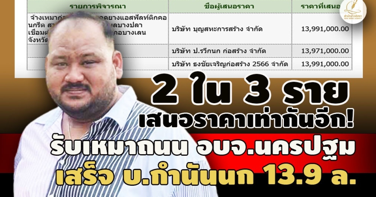 - ไส้ในเคสที่ 3 อบจ.นครปฐม! 3 ใน 4 รายเสนอราคาเท่ากัน บ.กำนันนกชนะ 26.6 ล.