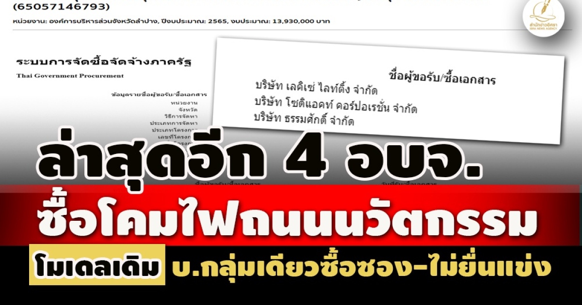 เปิดอีก 4 อบจ.อุตรดิตถ์ ลำปาง ชัยนาท เชียงใหม่ ซื้อโคมไฟถนนนวัตกรรม หลายสิบสัญญา พบโมเดลเดิม ใช้วิธีคัดเลือก บ.กลุ่มเดียวซื้อซอง แต่ไม่ยื่นแข่ง- บางสัญญายื่นเจ้าเดียวได้งาน