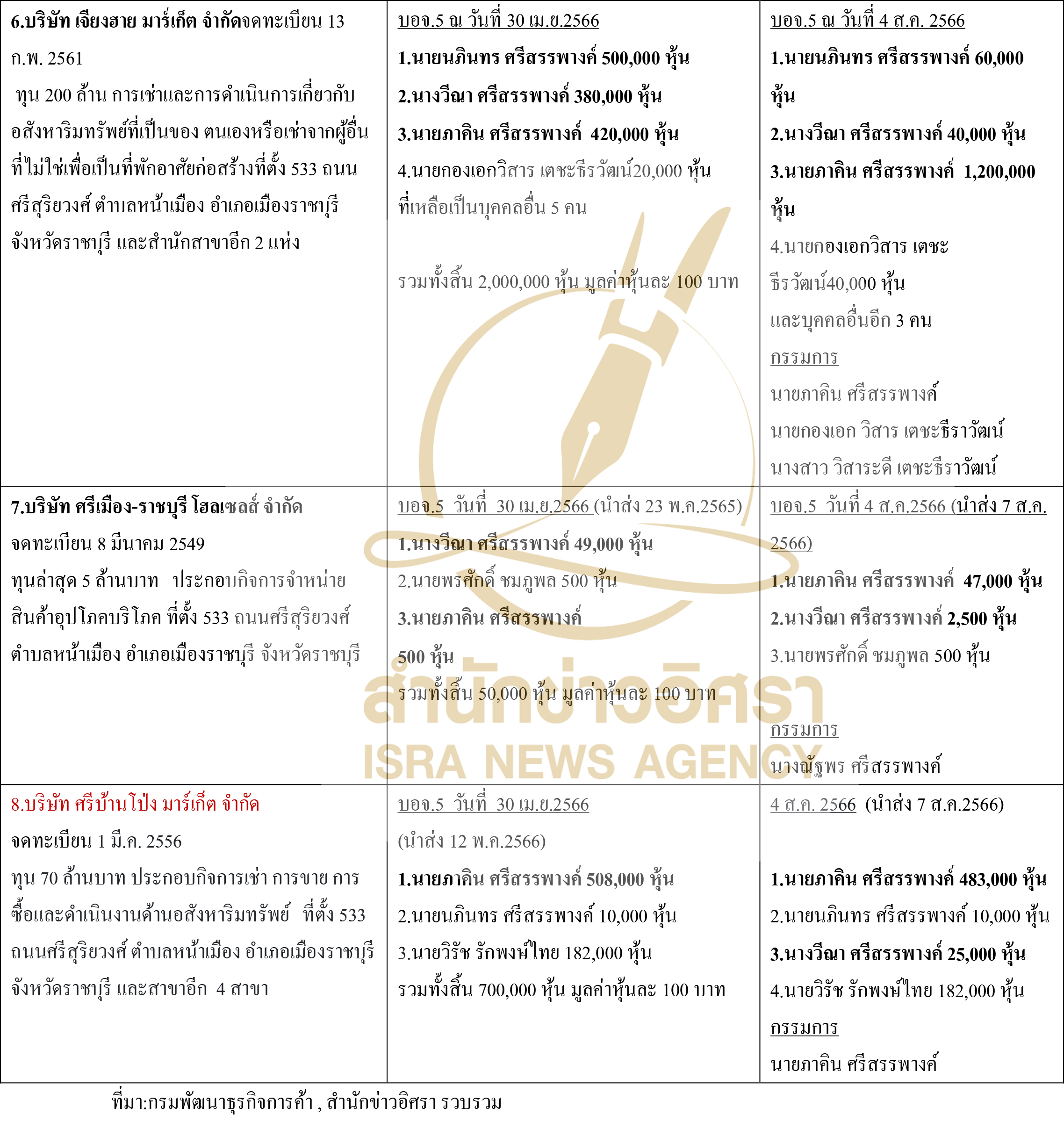 และมี 1 บริษัทที่ นายภาคิน ศรีสรรพางค์ บุตรชายโอนหุ้นให้มารดา คือ บริษัท ศรีบ้านโป่ง มาร์เก็ต จำกัด กล่าวคือ