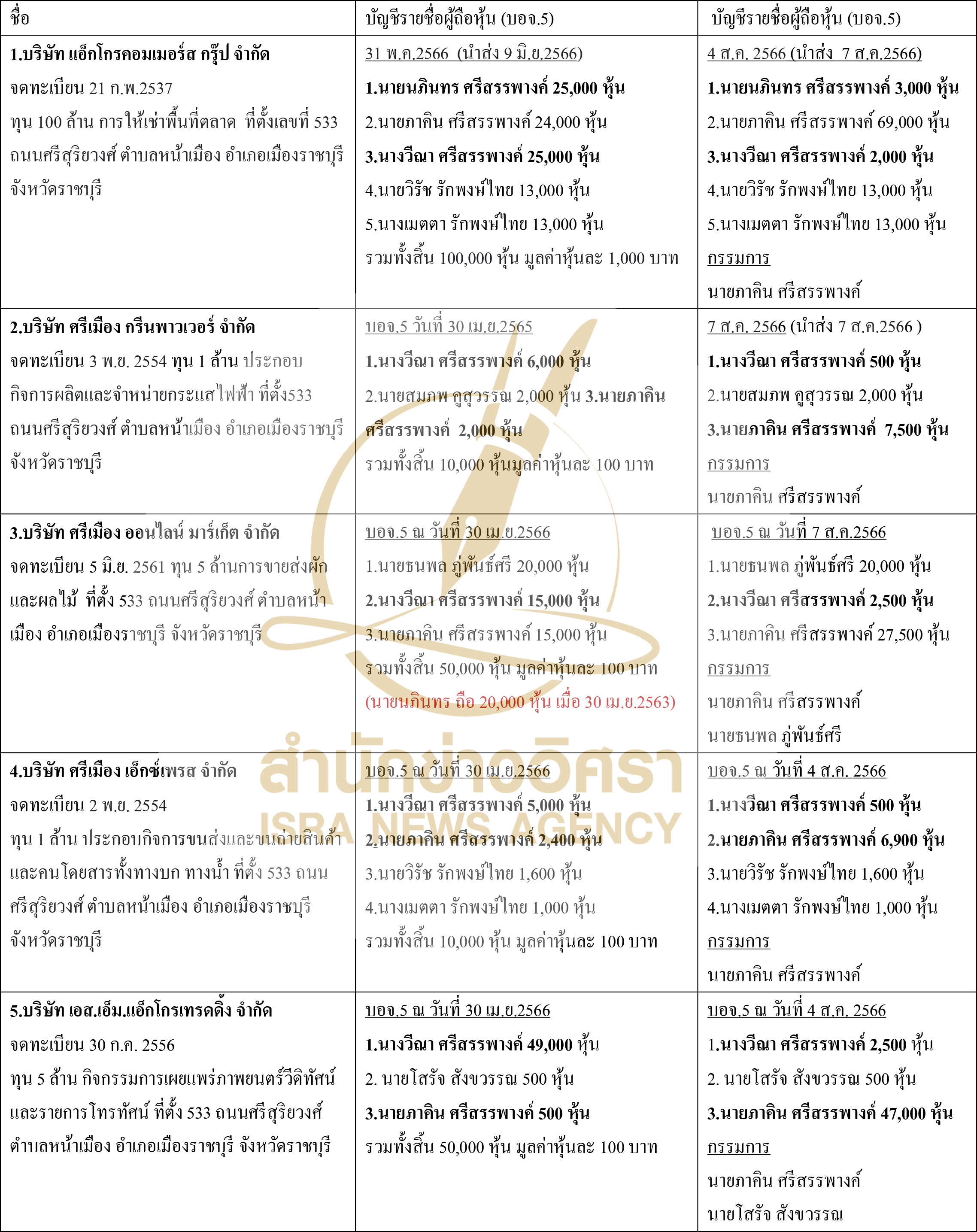 บอจ.5 วันที่ 4 ส.ค.2566 (นำส่ง 7 ส.ค.2566) นายภาคิน ศรีสรรพางค์ 47,000 หุ้น (เพิ่มขึ้น 46,500 หุ้น) นางวีณา ศรีสรรพางค์ 2,500 หุ้น (ลดลง 46,500 หุ้น) หรือคิดเป็น สัดส่วน 5% ของทุนจดทะเบียน 50,000 หุ้น มูลค่า 5 ล้านบาท หุ้นละ 100 บาท (ดูเอกสาร)
