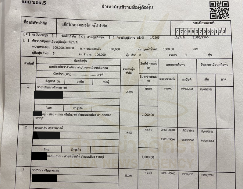 บอจ.5 ณ วันที่ 30 เม.ย.2566 นางวีณา ศรีสรรพางค์ 15,000 หุ้น นายภาคิน ศรีสรรพางค์ 15,000 หุ้น