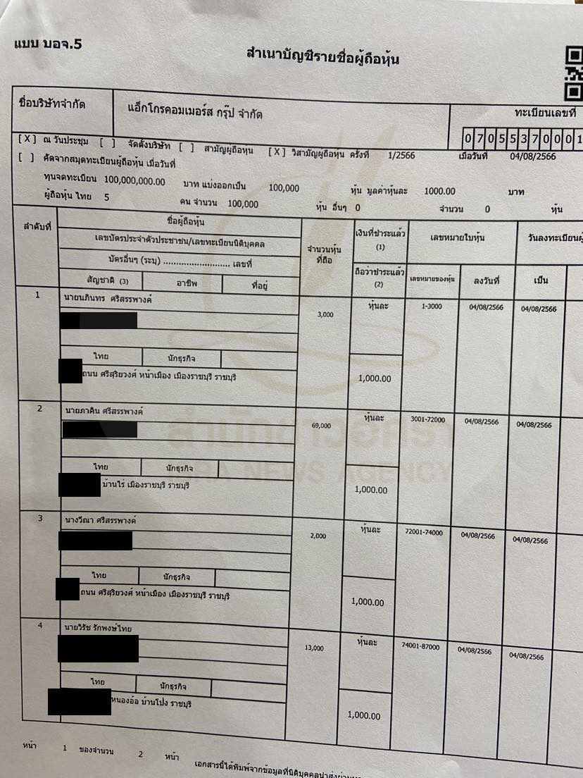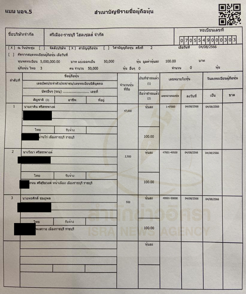 บัญชีรายชื่อผู้ถือหุ้น (บอจ.5) ณ วันที่ 4 ส.ค. 2566 (นำส่ง 7 ส.ค.2566) 1.นายนภินทร ศรีสรรพางค์ 3,000 หุ้น (ลดลง 22,000 หุ้น) หรือคิดเป็นสัดส่วน 3% ของทุนจดทะเบียน 100 ล้านบาทหุ้นทั้งหมด 100,000 หุ้น มูลค่าหุ้นละ 1,000 บาท 2.นายภาคิน ศรีสรรพางค์ 69,000 หุ้น (เพิ่มขึ้น 45,000 หุ้นมูลค่าหุ้นละ 1,000 บาท ) หรือ 69% ของทุนจดทะเบียน 3.นางวีณา ศรีสรรพางค์ 2,000 หุ้น (ลดลง 23,000หุ้น )หรือคิดเป็นสัดส่วน 2 % (ดูเอกสาร)