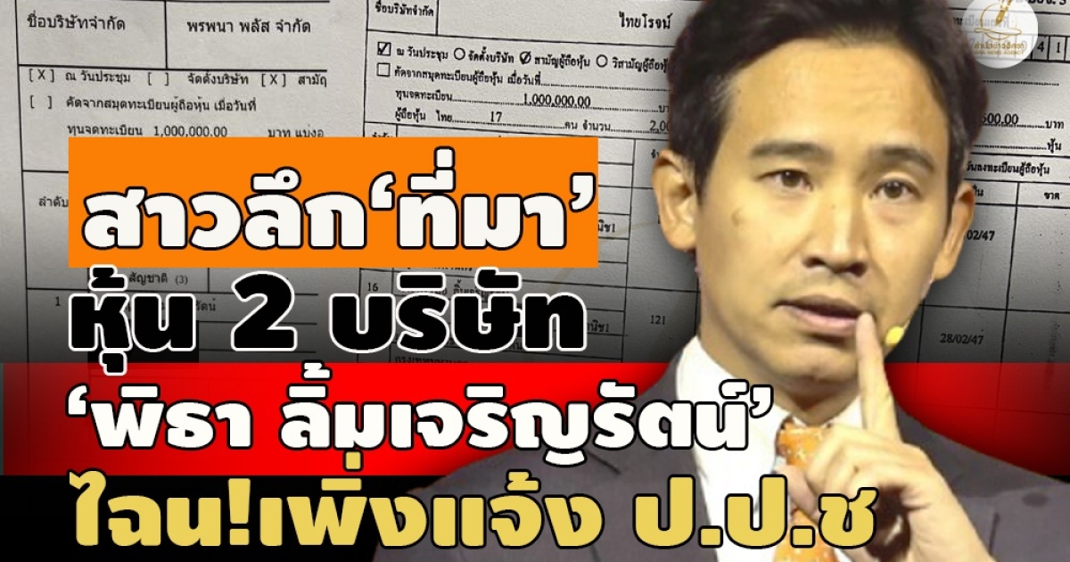 สาว ‘ที่มา’หุ้น 2 บ.‘พิธา’ ส.ส. อดีต หน.ก้าวไกล ในบัญชีทรัพย์สิน ป.ป.ช. ‘ไทยโรจน์’ ได้ปี 2556 ขณะที่ ‘พรพนา พลัส’ 1,000 หุ้นให้เช่าอสังหาฯ ไม่พบในบัญชีฯ 2 ครั้งก่อนหน้า หากใน อบจ.5 เป็นบุคคลคนเดียว‘พิชา ลิ้มเจริญรัตน์’ ?